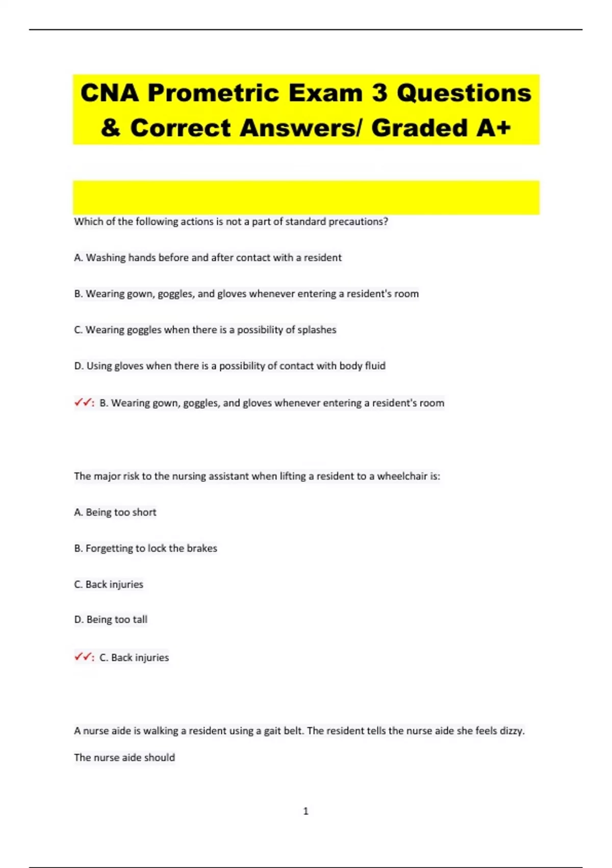 Which of the following actions is not a part of standard precautions? A. Washing hands before and after contact with a resident B. Wearing gown, goggles, and gloves whenever entering a resident's room C. Wearing goggles when there is a possibility of splashes D. Using gloves when there is a possibility of contact with body fluid : B. Wearing gown, goggles, and gloves whenever entering a resident's room The major risk to the nursing assistant when lifting a resident to a wheelchair is: A. Being too short B. Forgetting to lock the brakes C. Back injuries D. Being too tall : C. Back injuries A nurse aide is walking a resident using a gait belt. The resident tells the nurse aide she feels dizzy. The nurse aide should 2 A. Hold the gait belt tighter and ask the resident to rest for a minute B. Suggest the resident lean on the nurse aide for more support C. Guide the resident over to the handrail and ask to hold D. Ease the resident to the floor if a chair is not available : D. Ease the resident to the floor if a chair is not available Which of the following is most important when assisting resident with mouth care? A. Applying toothpaste to the toothbrush B. Assisting resident to a sitting position with HOB 60-90 degrees C. Allowing resident to rinse mouth with mouthwash D. Brushing the tongue gently : D. Assisting resident to a sitting position with HOB 60-90 degrees Gloves must be worn when brushing and flossing teeth to: A. Prevent the spread of infection. B. Prevent nurse assistant's hands from getting wet. C. Prevent nurse assistant from cutting her hands. D. Ensure a better grip on the toothbrush and dental floss. : A. Prevent the spread of infection 3 When a person is NPO, you should: A. Provide a variety of fluids. B. Offer fluids in small amounts from small containers. C. Remove the water pitcher and glass from the overbed table D. Prevent the person from having oral hygiene care. : C. Remove the water pitcher and glass from the overbed table The breathing of fluid, food, vomitus, or an obj