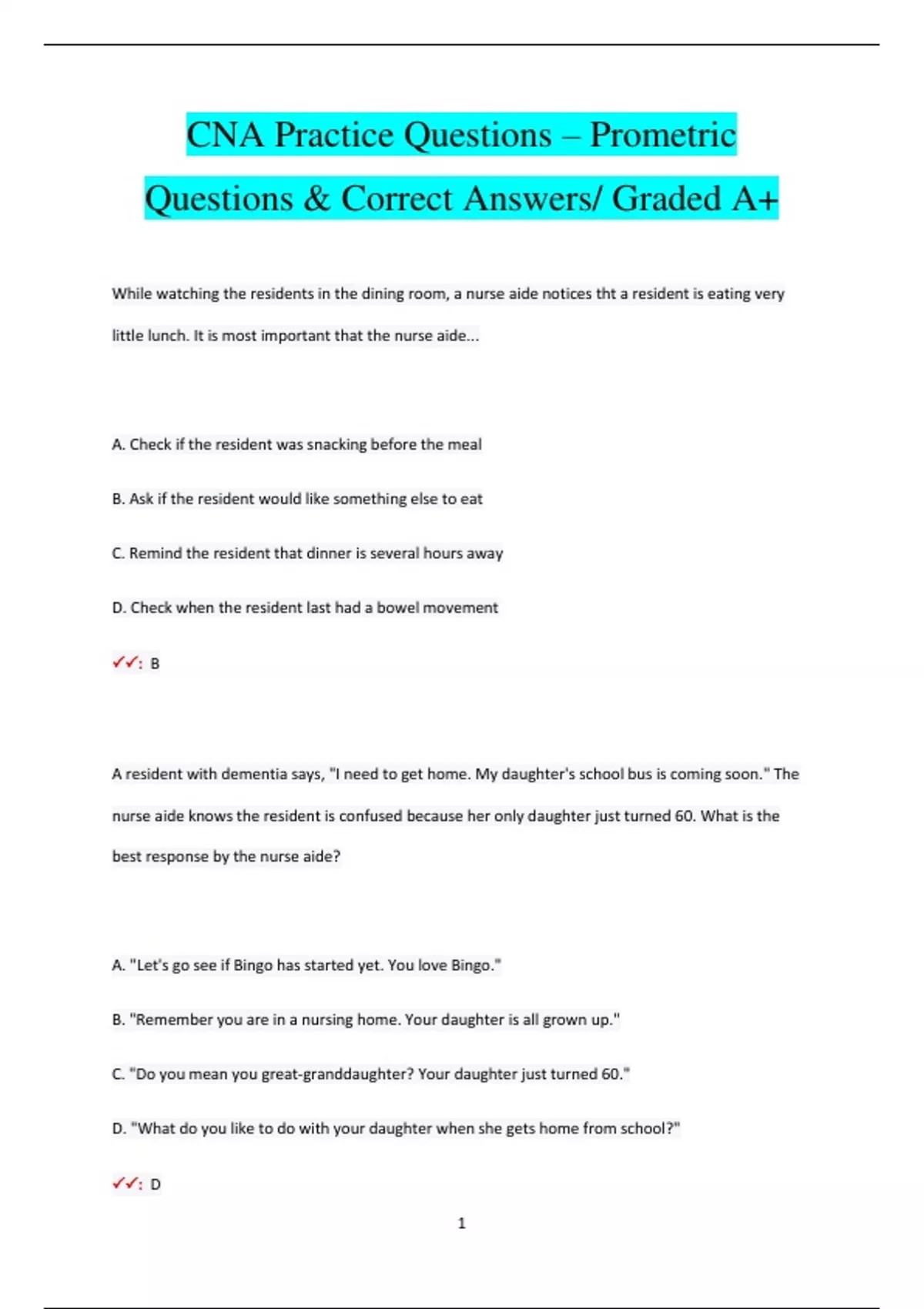CNA Practice Questions – Prometric Questions & Correct Answers/ Graded A+