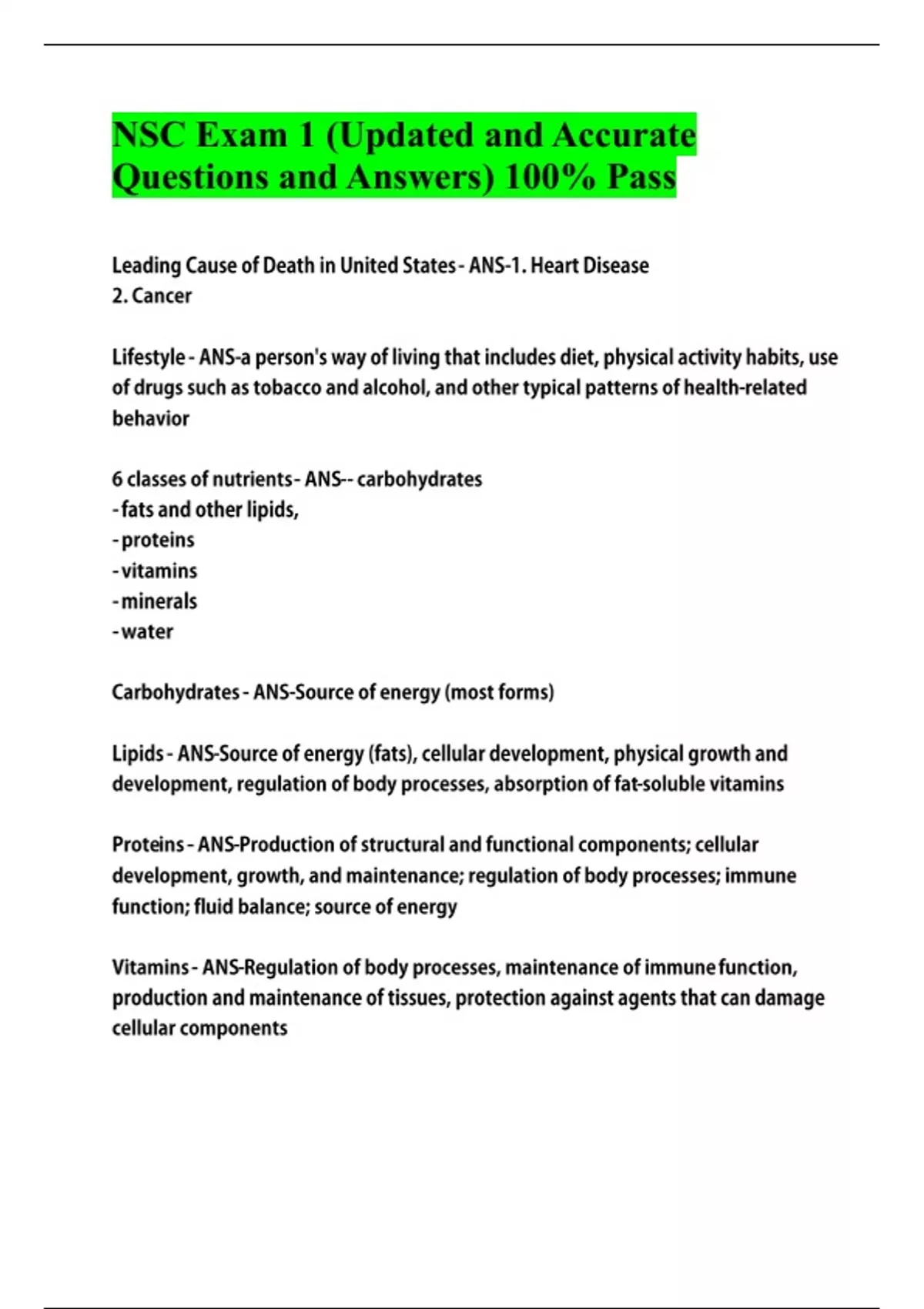 NSC Exam 1 (Updated and Accurate Questions and Answers) 100% Pass Leading Cause of Death in United States - ANS-1. Heart Disease 2. Cancer Lifestyle - ANS-a person's way of living that includes diet, physical activity habits, use of drugs such as tobacco and alcohol, and other typical patterns of health-related behavior 6 classes of nutrients - ANS-- carbohydrates - fats and other lipids, - proteins - vitamins - minerals - water Carbohydrates - ANS-Source of energy (most forms) Lipids - ANS-Source of energy (fats), cellular development, physical growth and development, regulation of body processes, absorption of fat-soluble vitamins Proteins - ANS-Production of structural and functional components; cellular development, growth, and maintenance; regulation of body processes; immune function; fluid balance; source of energy Vitamins - ANS-Regulation of body processes, maintenance of immune function, production and maintenance of tissues, protection against agents that can damage cellular components Minerals - ANS-Regulation of body processes, including fluid balance; formation of certain chemical messengers; structural and functional components of various substances and tissues; necessary for physical growth, maintenance, and development Water - ANS-Maintenance of fluid balance, regulation of body temperature, elimination of wastes, transportation of substances, participant in many chemical reactions How many kilocalories are in a gram of carbohydrates? - ANS-4 kcal How many kilocalories are in a gram of protein? - ANS-4 kcal How many kilocalories are in a gram of fat? - ANS-9 kcal How many kilocalories are in a gram of alcohol? - ANS-7 kcal Macronutrients - ANS-Name for carbohydrates, fats and proteins as the body needs a relativity large amount of these nutrients daily. Supply energy for cells Micronutrients - ANS-Name for vitamins and minerals as they body needs a very small amount of these to function properly. Do not Supply energy for cells Essential nutrients - ANS-Nutrients that must be supplied through food. About 50 of them Examples of some Essential Nutrients - ANS-Water Vitamin A Vitamin C B vitamins Vitamin D Glucose Minerals like calcium, sodium, chloride and Zinc Fats that contain linoleic and alpha-linolenic acids Some proteins (amino acids) Chpt 1 mod 1.3 pg 10 Nonnutrients - ANS-Substances that are not nutrients but may have some healthful benefits Examples of nonnutrients - ANS-Alcohol, phytochemicals phytochemicals - ANS-Compounds made in plants that are nonnutrients examples of phytochemicals - ANS-- Alpha-carotene, beta-carotene, lutein, lycopene - Quercetin - Anthocyanins - Resveratrol - Isoflavonoids - Sulfur compounds - Caffeine - Saponins - Capsaicin Dietary Supplement - ANS-a product (excluding tobacco) that contains a vitamin, a mineral, an herb or other plant product, an amino acid, or a dietary substance that supplements the diet by increasing total intake Why are antioxidants important? - ANS-An antioxidant protects cells and their components from being damaged or destroyed by chemically unstable factors Empty calories - ANS-Calories from unhealthy types of fatm added sugar and/or alcohol. Not a good source of vitamins and minerals. Foods like candies, pastries, snack chips, sugar-sweetened drinks, and some alcoholic beverages Nutrient-dense - ANS-Describes foods or beverages that contain more beneficial nutrients in relation to total calories. Foods like broccoli, leafy greens, fat-free milk, orange juice , lean meats, and whole-grain cereals
