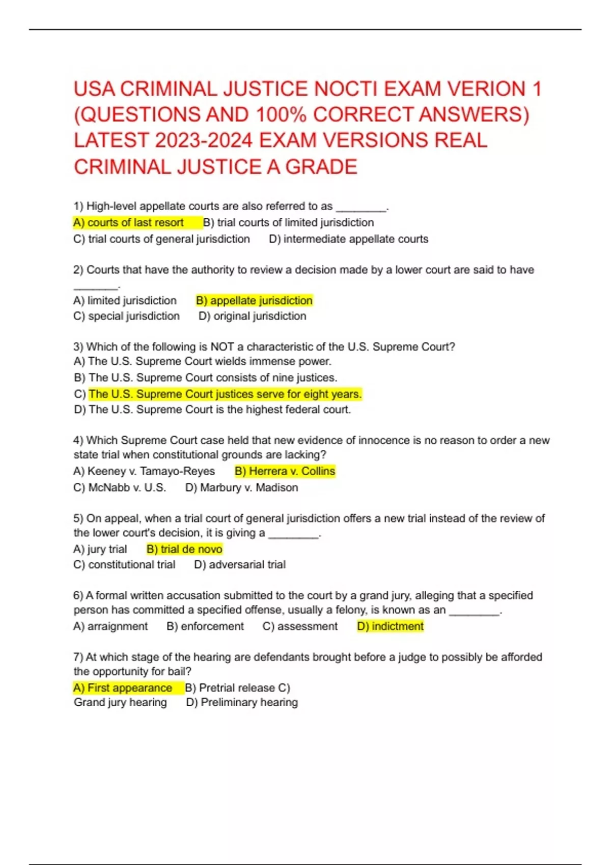 USA CRIMINAL JUSTICE NOCTI EXAM VERION 1 (QUESTIONS AND 100% CORRECT ANSWERS) LATEST EXAM VERSIONS REAL CRIMINAL JUSTICE A GRADE