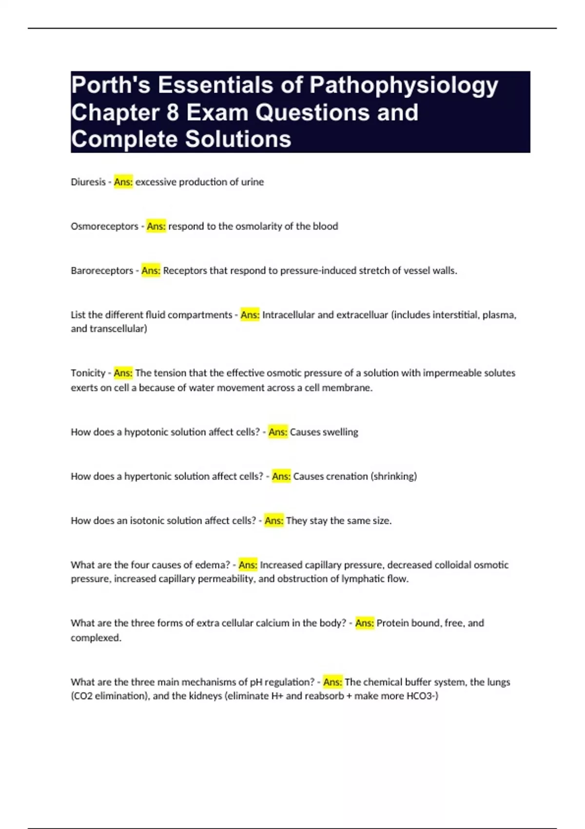 Porth's Essentials of Pathophysiology Chapter 8 Exam Questions and Complete Solutions Diuresis - Ans: excessive production of urine Osmoreceptors - Ans: respond to the osmolarity of the blood Baroreceptors - Ans: Receptors that respond to pressure-induced stretch of vessel walls. List the different fluid compartments - Ans: Intracellular and extracelluar (includes interstitial, plasma, and transcellular) Tonicity - Ans: The tension that the effective osmotic pressure of a solution with impermeable solutes exerts on cell a because of water movement across a cell membrane. How does a hypotonic solution affect cells? - Ans: Causes swelling How does a hypertonic solution affect cells? - Ans: Causes crenation (shrinking) How does an isotonic solution affect cells? - Ans: They stay the same size. What are the four causes of edema? - Ans: Increased capillary pressure, decreased colloidal osmotic pressure, increased capillary permeability, and obstruction of lymphatic flow. What are the three forms of extra cellular calcium in the body? - Ans: Protein bound, free, and complexed. What are the three main mechanisms of pH regulation? - Ans: The chemical buffer system, the lungs (CO2 elimination), and the kidneys (eliminate H+ and reabsorb + make more HCO3-) Diffusion - Ans: Movement of charged or uncharged particles along a concentration gradient. Osmosis - Ans: Movement of water across a semipermeable membrane. Describe the factors that control capillary fluid exchange between the vascular and interstitial fluid compartments - Ans: 1. Capillary filtration pressure: pushes water out of the capillary and into interstitial. 2. Capillary colloidal osmotic pressure: pulls water back into capillary. 3. Interstitial hydrostatic pressure: oppose movement of water outside capillary. 4. Tissue colloidal osmotic pressure: pulls water out of capillary into interstitial. What is third spacing? - Ans: The accumulation of ECF in the interstitial space (often transcellular space eg. pericardial sac, peritoneal cavity, pleural cavity) Hypodipsia - Ans: Decrease in the ability to sense thirst often associated with cerebral lesions in the hypothalamus. Polydipsia - Ans: excessive thirst