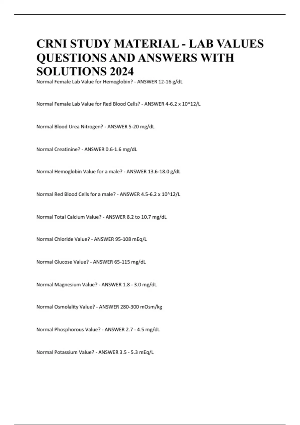 CRNI STUDY MATERIAL - LAB VALUES QUESTIONS AND ANSWERS WITH SOLUTIONS 2024