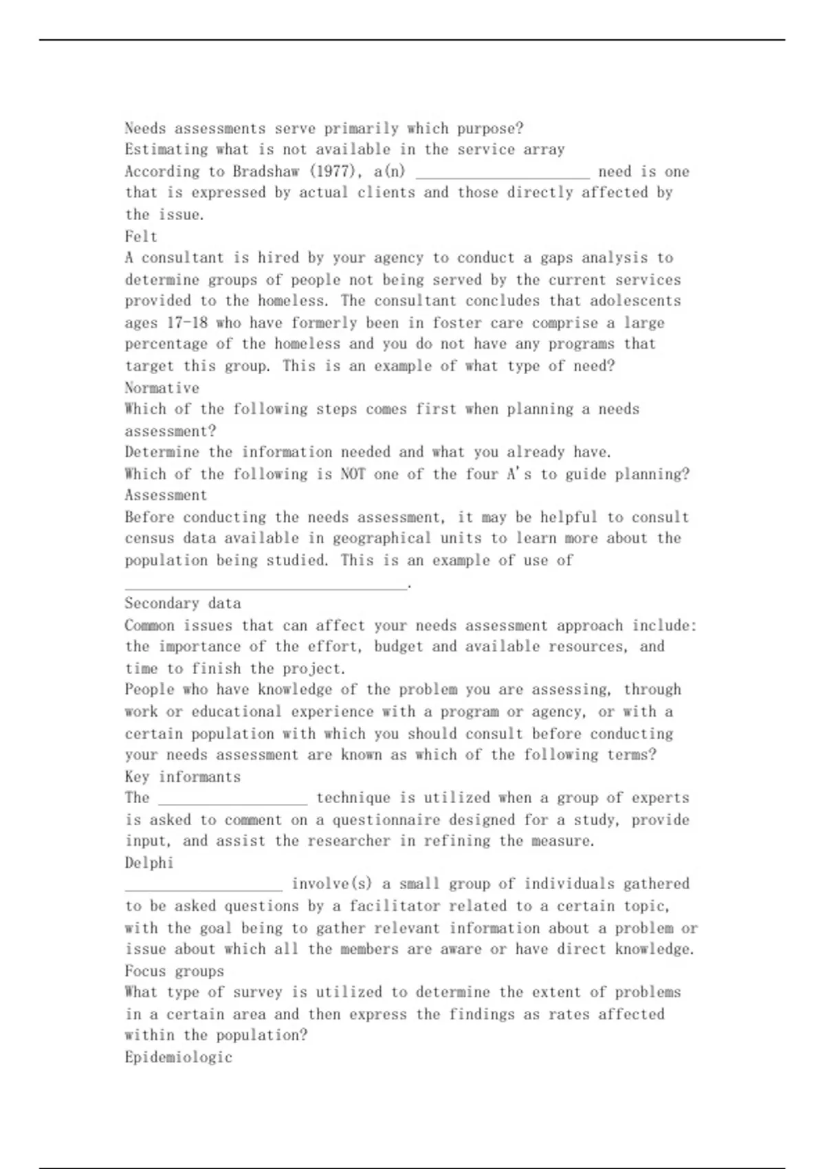 Needs assessments serve primarily which purpose? Estimating what is not available in the service array According to Bradshaw (1977), a(n) _____________________ need is one that is expressed by actual clients and those directly affected by the issue. Felt A consultant is hired by your agency to conduct a gaps analysis to determine groups of people not being served by the current services provided to the homeless. The consultant concludes that adolescents ages 17-18 who have formerly been in foster care comprise a large percentage of the homeless and you do not have any programs that target this group. This is an example of what type of need? Normative Which of the following steps comes first when planning a needs assessment? Determine the information needed and what you already have. Which of the following is NOT one of the four A's to guide planning? Assessment Before conducting the needs assessment, it may be helpful to consult census data available in geographical units to learn more about the population being studied. This is an example of use of __________________________________. Secondary data Common issues that can affect your needs assessment approach include: the importance of the effort, budget and available resources, and time to finish the project. People who have knowledge of the problem you are assessing, through work or educational experience with a program or agency, or with a certain population with which you should consult before conducting your needs assessment are known as which of the following terms? Key informants The __________________ technique is utilized when a group of experts is asked to comment on a questionnaire designed for a study, provide input, and assist the researcher in refining the measure. Delphi ___________________ involve(s) a small group of individuals gathered to be asked questions by a facilitator related to a certain topic, with the goal being to gather relevant information about a problem or issue about which all the members are aware or have direct knowledge. Focus groups What type of survey is utilized to determine the extent of problems in a certain area and then express the findings as rates affected within the population? Epidemiologic A researcher utilizes a survey as well as focus groups to determine the outcomes of a particular intervention. When analyzing the data, the researcher is careful to analyze how the different focus groups as well as the survey yield similar findings (or not). This is called what type of analysis? Convergent Needs assessments are a final step to take when developing a new program. True or False? False An expressed need is when a need of one group is determined to be the need of a group with similar characteristics, but you are unable to talk to the other group directly. True or False? False When disseminating the results of the needs assessment, you should present preliminary results to the stakeholders before finalizing and presenting the information to the community. True or False? True Previously collected data for another purpose cannot be used by researchers for program evaluation studies. True or False? False Public hearings and community forums are not considered methods of needs assessments. True or False? False When collecting data by using a survey, asking people who live close to your agency and/or seek services from there will yield results that adequately represent the community. True or False? False A focus on naturalistic inquiry, use of the researcher as an instrument in data collection, and reports that focus on narrative are common ingredients of what type of studies? Qualitative _____________ methods are typically used to study process evaluation, while ________________methods are typically used to determine outcomes. Qualitative; Quantitative In qualitative analysis, what is usually the unit of analysis? Individuals The type of sampling utilized when needing to explore people who have had unusual successes or failures as a result of participation in a program is called _________________________. Deviant case sampling Which of the following is/are a form of data collection in qualitative research? taking notes when observing services provided, transcripts from interviews conducted, documents and other existing data acquired When collecting data in a qualitative study, and you begin to notice repetition in the data and confirmation of existing findings, not anything new revealed, this point is termed what? Saturation Qualitative methods: Provide vivid descriptions and an understanding of how results came to pass. Using more than one type of data collection to corroborate findings and verify the interpretations from each is known as ________________________________. Triangulation of data What is important to include in a qualitative report, because it is often the only section closely read by those to whom the report is disseminated? Conclusions and recommendations A study design that focuses on empowering the least powerful stakeholders in the evaluation, and valuing their input from the beginning to the end of the study is known as _____________________. Participatory evaluation When planning a qualitative research study, what areas typically require the most work, and therefore must be well-planned in order to meet your budgets and timeline? Data collection and analysis Like quantitative methods, qualitative analysis is empirical and systematic, with analysis grounded in the data. True or False? True Historically speaking, evaluation research has been primarily qualitative in nature. True or False? False It is generally considered best practice to use qualitative methods to evaluate community level practice, as opposed to single-system designs. True CONTINUED.....
