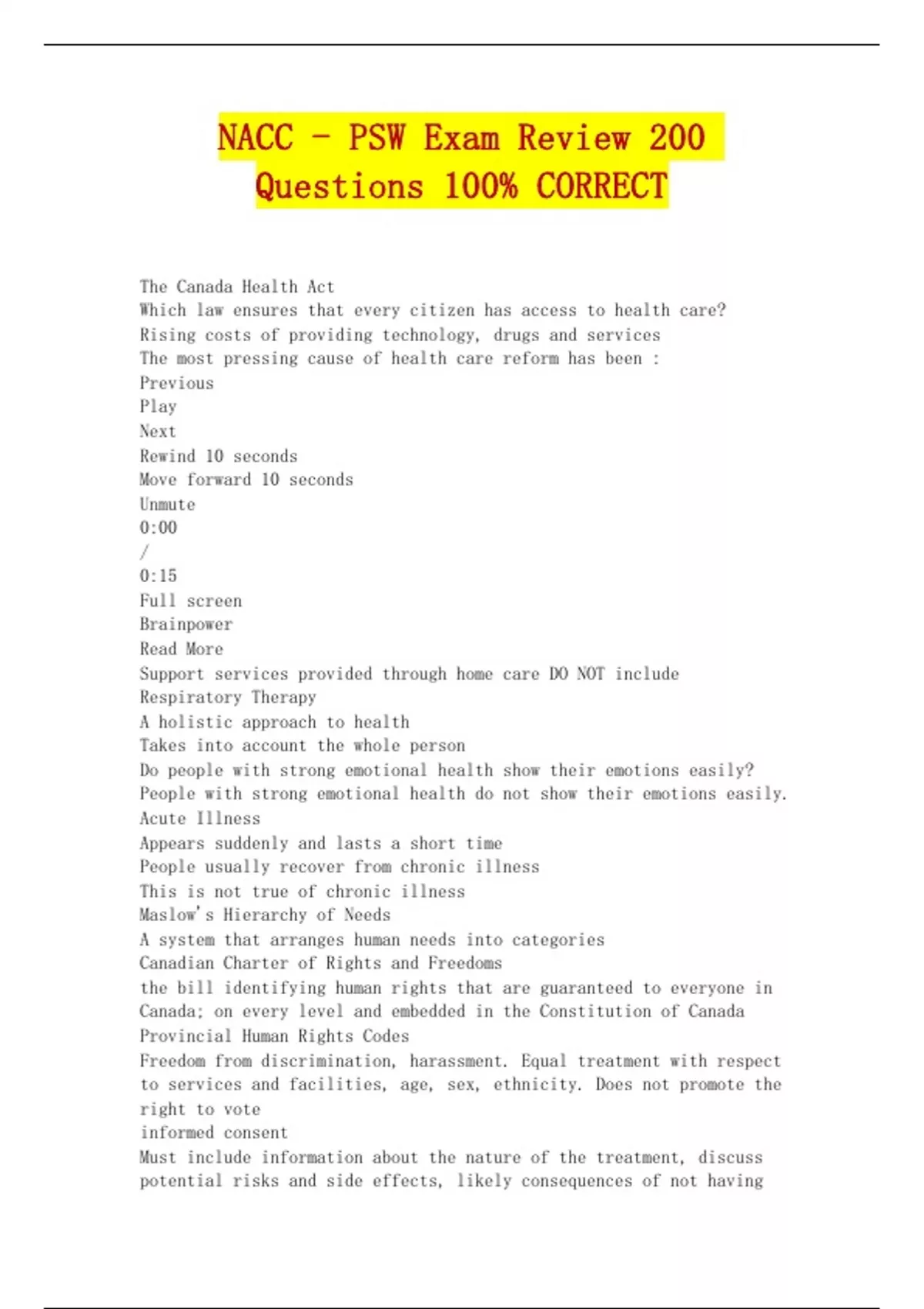 The Canada Health Act Which law ensures that every citizen has access to health care? Rising costs of providing technology, drugs and services The most pressing cause of health care reform has been : Support services provided through home care DO NOT include Respiratory Therapy A holistic approach to health Takes into account the whole person Do people with strong emotional health show their emotions easily? People with strong emotional health do not show their emotions easily. Acute Illness Appears suddenly and lasts a short time People usually recover from chronic illness This is not true of chronic illness Maslow's Hierarchy of Needs A system that arranges human needs into categories Canadian Charter of Rights and Freedoms the bill identifying human rights that are guaranteed to everyone in Canada; on every level and embedded in the Constitution of Canada Provincial Human Rights Codes Freedom from discrimination, harassment. Equal treatment with respect to services and facilities, age, sex, ethnicity. Does not promote the right to vote informed consent Must include information about the nature of the treatment, discuss potential risks and side effects, likely consequences of not having the treatment. Does not include reassurance that this is the best and only option. Negligence careless neglect, often resulting in injury. Prison term is unlikely. Assault Intentional attempt or threat to touch a persons body without the persons consent. False Imprisonment the illegal restraint of another person's movement prejudice preconceived opinion that is not based on reason or actual experience Activities of Daily Living Self care activities that people perform to remain independant and function in society Unregulated Health Care Provider Personal Support Worker Professionalism An approach to work that demonstrates a respect for others, commitment, competence and appropriate behaviour Hospitals Work settings that provide acute care respite services service that provides a temporary break to family caregivers Residents in retirement facilities older adults with limited care needs Membership of the healthcare team determined by the clients needs opportunity for collaboration benefits of team approach to health care Case manager evaluates a clients needs and coordinates the services of the health care in a community team Delegated task responsibility You, and the RN are responsible Stress the emotional, behavioural, or physical response to an event or situation. Not influenced by gender. Displacement When you respond in anger to someone who was not the person who angered you. S.M.A.R.T Specific, Measurable, Achievable, Realistic, Timely Non-maleficence duty to do no harm, provide a safe environment Autonomy self-government, respecting personal preferences Function of the Care Plan Provide central reference point on the clients health problems, needs and care for communication and to ensure everyone provides the same care. NOT to provide information that never changes. Subjective Data things a person tells you about that you cannot observe through your senses; symptoms Graphic sheet used to record measurements and observations made three to four times per day.CONTINUED.....