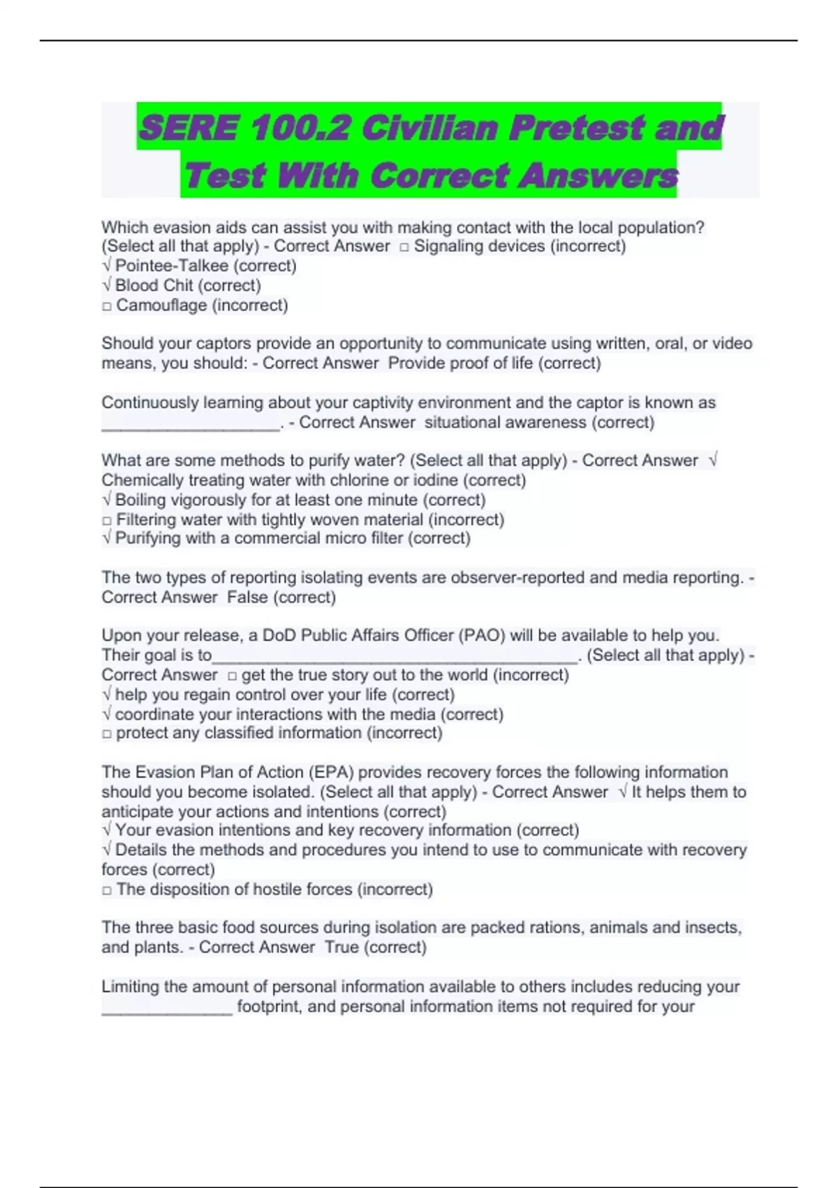 SERE 100.2 Civilian Pretest and Test With Correct Answers
