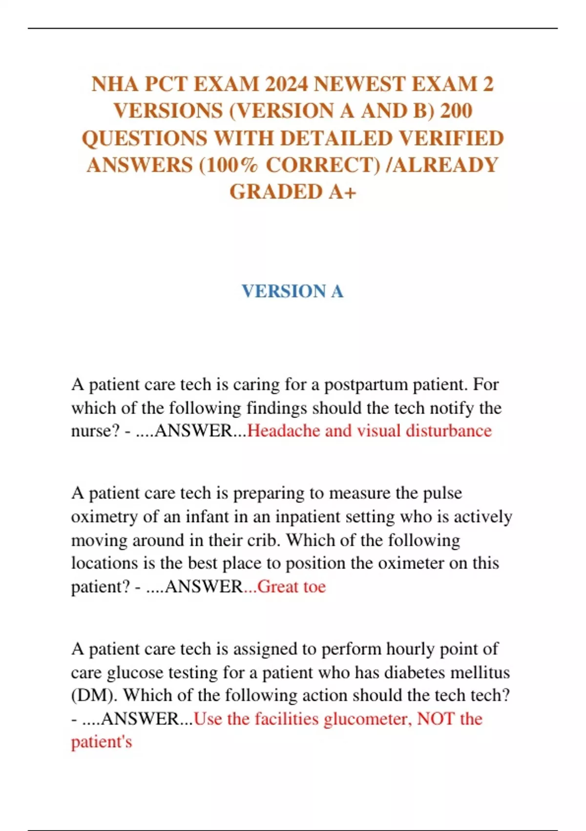 NHA PCT EXAM 2024 NEWEST EXAM 2 VERSIONS (VERSION A AND B) 200 QUESTIONS WITH DETAILED VERIFIED ANSWERS (100% CORRECT) /ALREADY GRADED A+