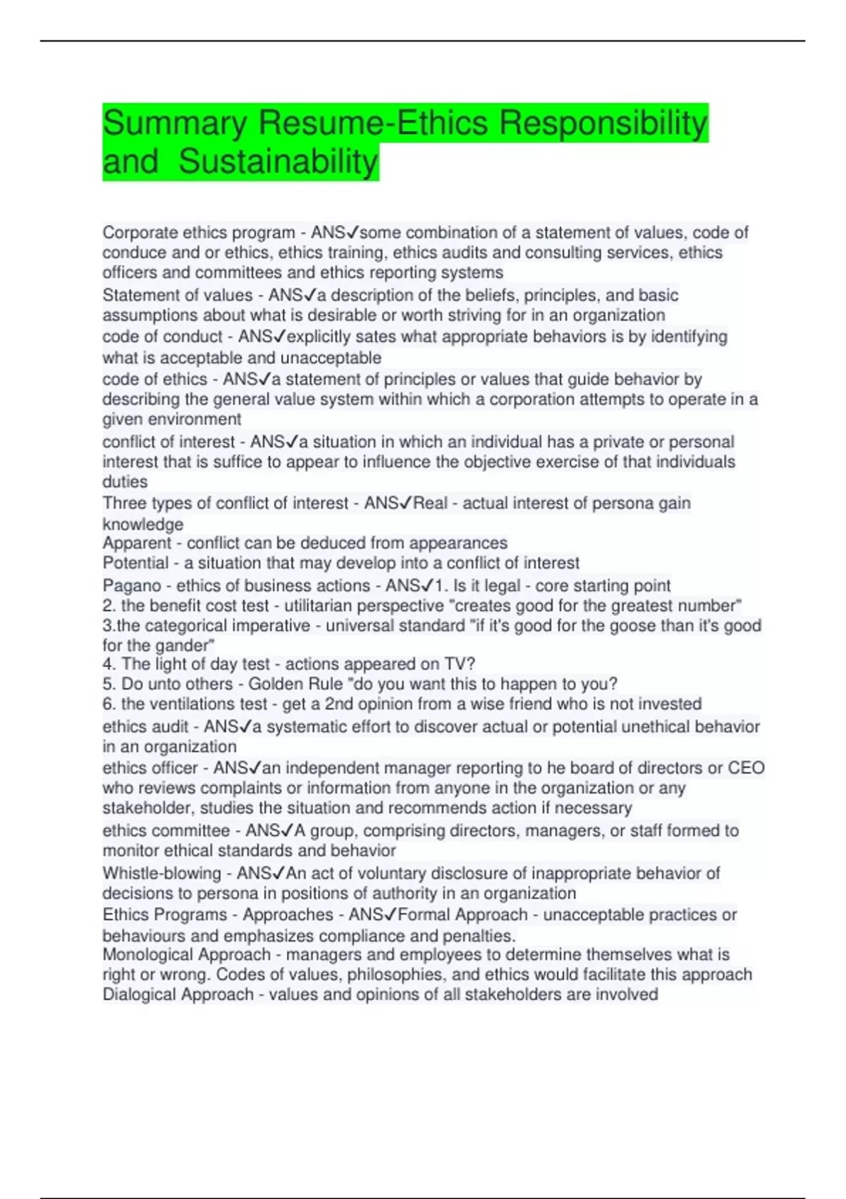 Summary Ethics Responsibility and Sustainability
