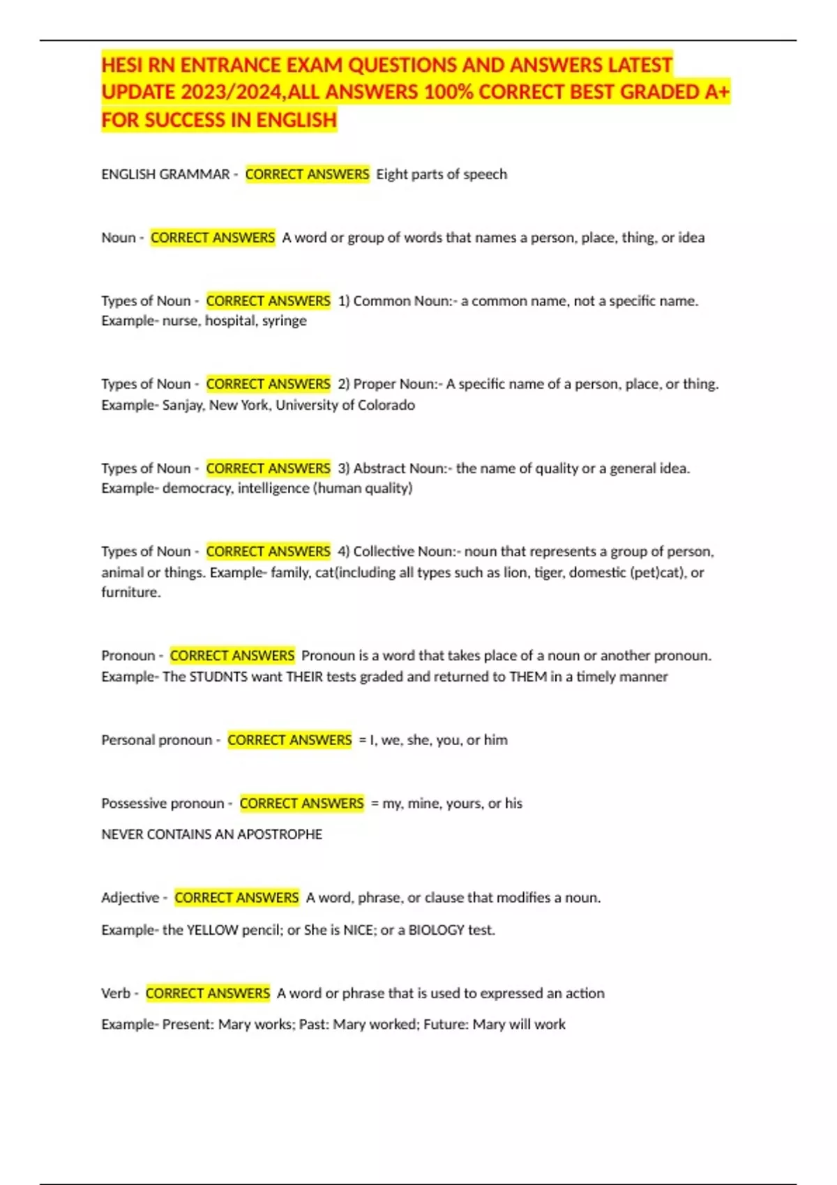 HESI RN ENTRANCE EXAM QUESTIONS AND ANSWERS LATEST UPDATE 2023/2024,ALL ANSWERS 100% CORRECT BEST GRADED A+ FOR SUCCESS IN ENGLISH