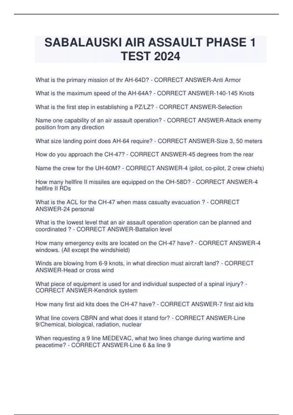 SABALAUSKI AIR ASSAULT PHASE 1 TEST 2024 What is the primary mission of thr AH-64D? - CORRECT ANSWER-Anti Armor What is the maximum speed of the AH-64A? - CORRECT ANSWER-140-145 Knots What is the first step in establishing a PZ/LZ? - CORRECT ANSWER-Selection Name one capability of an air assault operation? - CORRECT ANSWER-Attack enemy position from any direction What size landing point does AH-64 require? - CORRECT ANSWER-Size 3, 50 meters How do you approach the CH-47? - CORRECT ANSWER-45 degrees from the rear Name the crew for the UH-60M? - CORRECT ANSWER-4 (pilot, co-pilot, 2 crew chiefs) How many hellfire II missiles are equipped on the OH-58D? - CORRECT ANSWER-4 hellfire II RDs What is the ACL for the CH-47 when mass casualty evacuation ? - CORRECT ANSWER-24 personal What is the lowest level that an air assault operation operation can be planned and coordinated ? - CORRECT ANSWER-Battalion level How many emergency exits are located on the CH-47 have? - CORRECT ANSWER-4