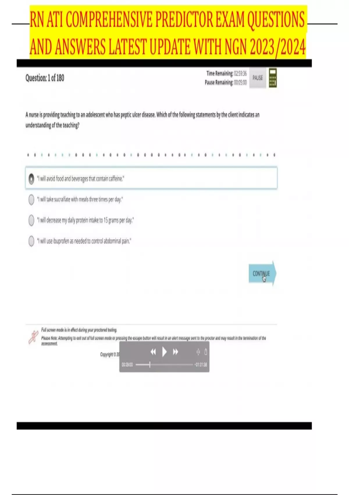 ATI ADULT MED SURG /ATI RN ADULT MEDICAL SURGICAL (NGN) 2023 QUESTIONS WITH VERIFIED ANSWERS/A+ GRADE ASSURED • "I will need to take antibiotics for 1 year." – INCORRECT o A client who has severe stage I Lyme disease will be prescribed a 30-day course of antibiotics. The nurse should emphasize to the client that, like with other types of infection, the full course of antibiotics should be completed. • "My partner will need to take an antiviral medication." – INCORRECT o Lyme disease is a vector-borne illness that is treated with antibiotics. Other vector-borne illnesses, such as West Nile Virus, are treated with antiviral medications. Lyme disease is not transmitted to others via human contact. • "My joints ache because I have Lyme disease." – CORRECT o Lyme disease is a vector-borne illness transmitted by the deer tick. The disease course occurs in three stages beginning with joint and muscle pain in stage I. If left untreated, these symptoms continue throughout stage I and, by stage Ill, become chronic. Other chronic complications include memory problems and fatigue • "I bruise easily because I have Lyme disease. – INCORRECT o Lyme disease is an infectious disease that affects the body systemically, involving the neurologic, musculoskeletal, and cardiac systems. Cardiac manifestations include carditis and dysrhythmias. However, a client who has stage Il Lyme disease does not typically experience bruising. • Extremity cool upon palpation – CORRECT o The nurse should report indicators of reduced circulation, such as pallor, cool temperature, or paresthesia of the client's extremity. These findings can indicate that the client is at risk for developing acute compartment syndrome. • Serosanguineous drainage on the dressing – INCORRECT o Serosanguineous, or blood-tinged, drainage on the dressing is an expected finding following surgery. Serosanguineous drainage is present the first few days following surgery as the wound heals. • Capillary refill of 2 seconds – INCORRECT o A capillary refill of 2 seconds is within the expected reference range and indicates the client has adequate arterial blood flow. A delay in capillary refill can indicate an earl manifestation of acute compartment syndrome. • Client report of discomfort when moving toes – INCORRECT o A report of discomfort when moving toes is an expected finding following surgery. However, a report of increased pain at the surgical site when moving can indicate an early manifestation of acute compartment syndrome. • The client starts to cough. – INCORRECT o The nurse should expect the client to cough during suctioning of a tracheostomy due to bronchial stimulation. • The client's heart rate increases. – CORRECT o Hypoxia related to suctioning can cause the client's heart rate to increase. If this occurs, the nurse should discontinue the suctioning and manually oxygenate the client with 100% oxygen. The nurse should instruct the client to take three or four deep breaths prior to suctioning to reduce the risk for hypoxia. • The client is diaphoretic. – INCORRECT o Diaphoresis is not associated with suction-induced hypoxia. However, long-term hypoxia can lead to diaphoresis. • The client's blood pressure decreases. – INCORRECT o A clients blood pressure can increase initially with hypoxia. If this occurs, the nurse should stop suctioning and manually oxygenate the client. Long-term hypoxia can lead to a decrease in blood