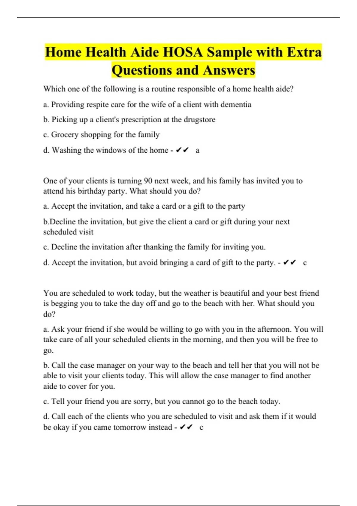 Home Health Aide HOSA Sample with Extra Questions and Answers