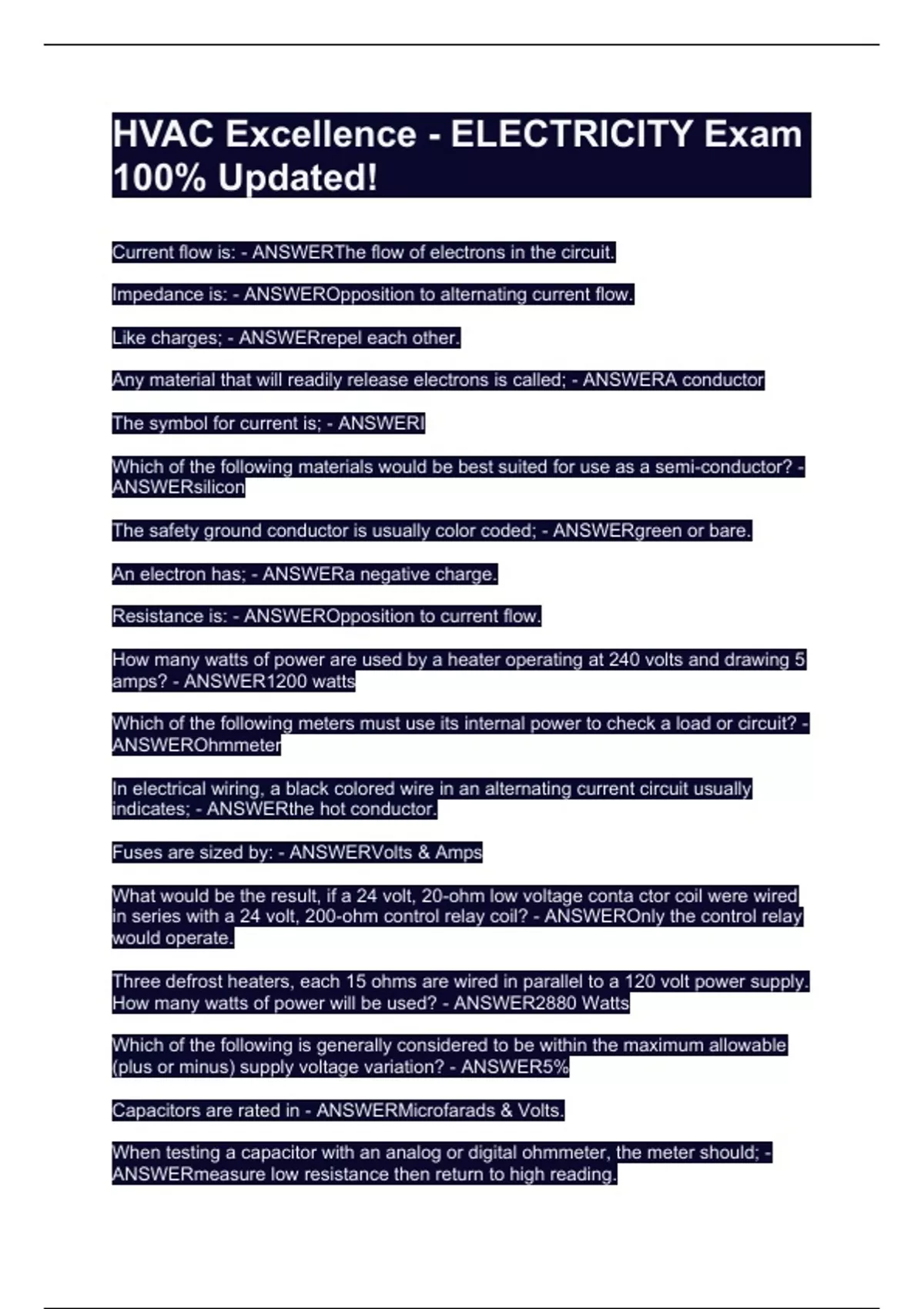 HVAC Excellence - ELECTRICITY Exam 100% Updated!