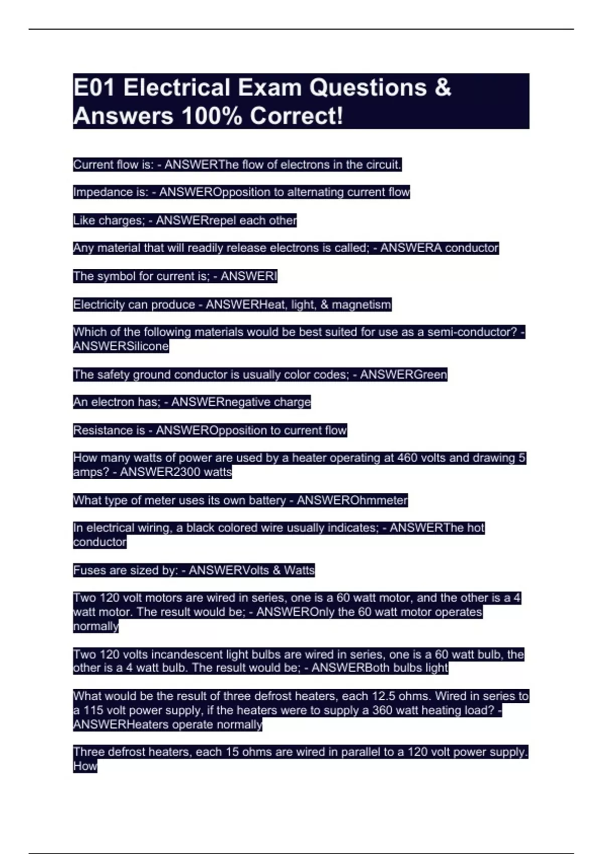 E01 Electrical Exam Questions & Answers 100% Correct!