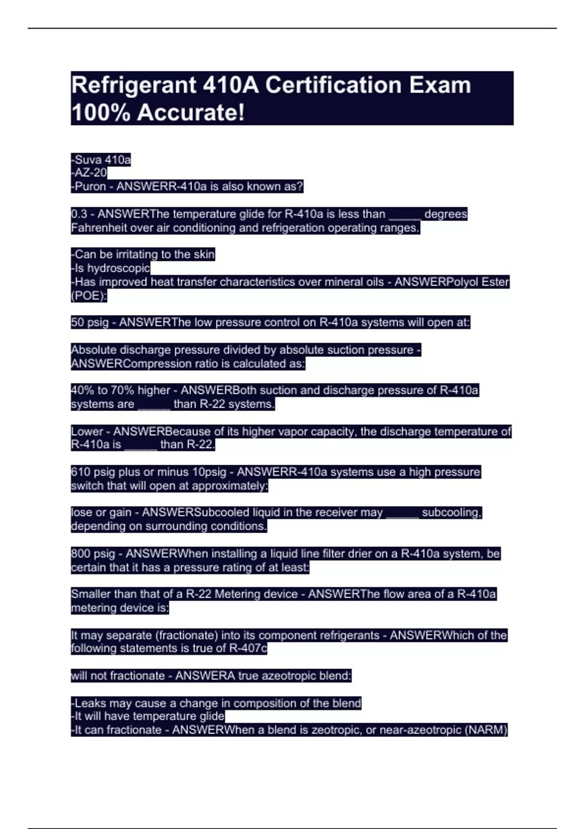 -Suva 410a -AZ-20 -Puron - ANSWERR-410a is also known as? 0.3 - ANSWERThe temperature glide for R-410a is less than _____ degrees Fahrenheit over air conditioning and refrigeration operating ranges. -Can be irritating to the skin -Is hydroscopic -Has improved heat transfer characteristics over mineral oils - ANSWERPolyol Ester (POE): 50 psig - ANSWERThe low pressure control on R-410a systems will open at: Absolute discharge pressure divided by absolute suction pressure - ANSWERCompression ratio is calculated as: 40% to 70% higher - ANSWERBoth suction and discharge pressure of R-410a systems are _____ than R-22 systems. Lower - ANSWERBecause of its higher vapor capacity, the discharge temperature of R-410a is _____ than R-22. 610 psig plus or minus 10psig - ANSWERR-410a systems use a high pressure switch that will open at approximately: lose or gain - ANSWERSubcooled liquid in the receiver may _____ subcooling, depending on surrounding conditions. 800 psig - ANSWERWhen installing a liquid line filter drier on a R-410a system, be certain that it has a pressure rating of at least: Smaller than that of a R-22 Metering device - ANSWERThe flow area of a R-410a metering device is: