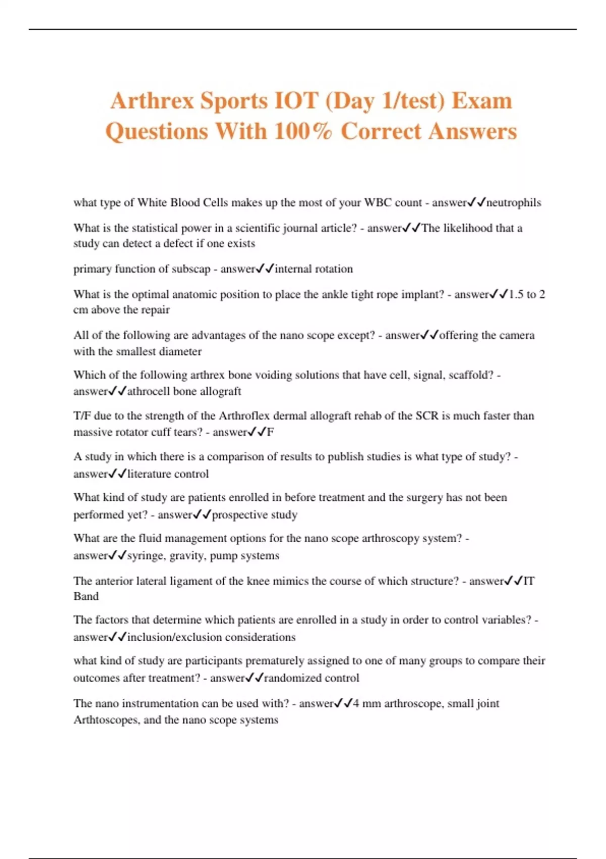 Arthrex Sports IOT (Day 1/test) Exam Questions With 100% Correct Answers what type of White Blood Cells makes up the most of your WBC count - answerneutrophils What is the statistical power in a scientific journal article? - answerThe likelihood that a study can detect a defect if one exists primary function of subscap - answerinternal rotation What is the optimal anatomic position to place the ankle tight rope implant? - answer1.5 to 2 cm above the repair All of the following are advantages of the nano scope except? - answeroffering the camera with the smallest diameter Which of the following arthrex bone voiding solutions that have cell, signal, scaffold? - answerathrocell bone allograft T/F due to the strength of the Arthroflex dermal allograft rehab of the SCR is much faster than massive rotator cuff tears? - answerF A study in which there is a comparison o