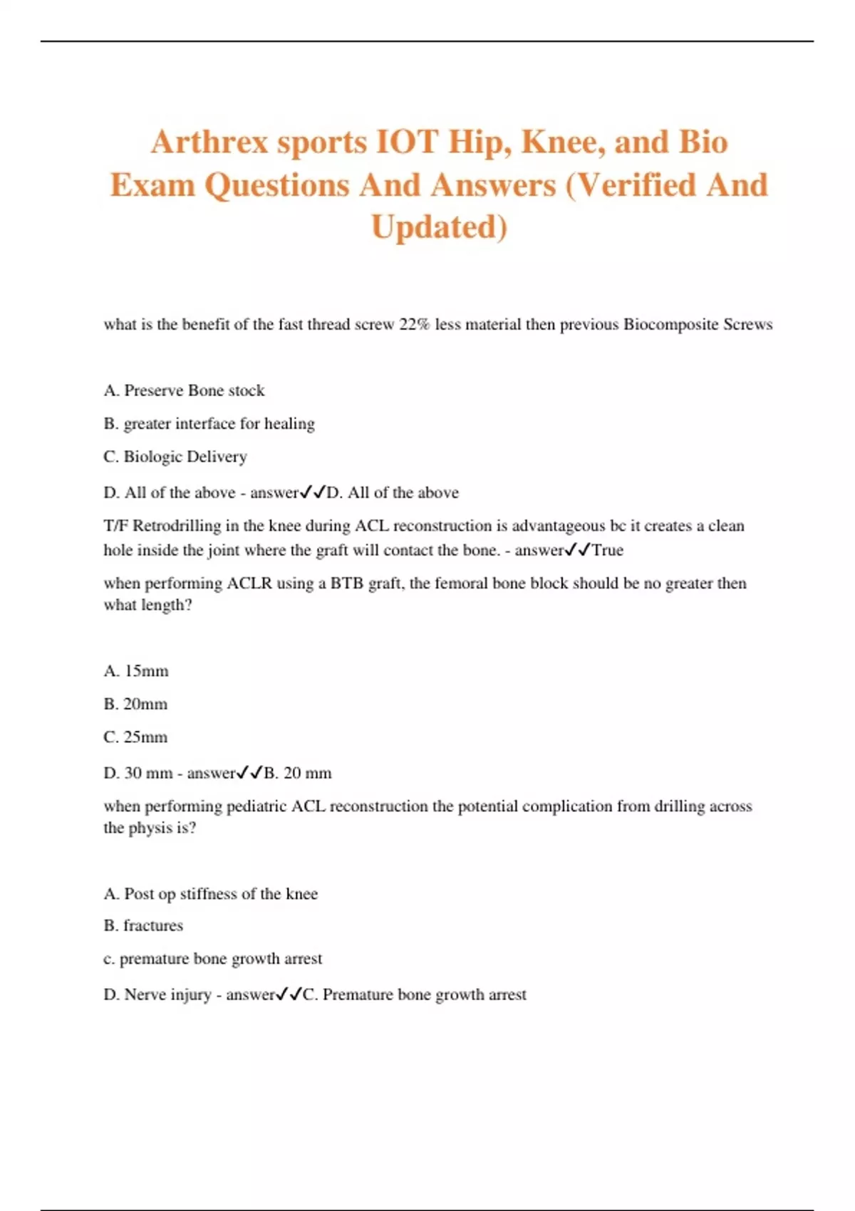 Arthrex sports IOT Hip, Knee, and Bio Exam Questions And Answers (Verified And Updated) what is the benefit of the fast thread screw 22% less material then previous Biocomposite Screws A. Preserve Bone stock B. greater interface for healing C. Biologic Delivery D. All of the above - answerD. All of the above T/F Retrodrilling in the knee during ACL reconstruction is advantageous bc it creates a clean hole inside the joint where the graft will contact the bone. - answerTrue when performing ACLR using a BTB graft, the femoral bone block should be no greater then what length? A. 15mm B. 20mm C. 25mm D. 30 mm - answerB. 20 mm when performing pediatric ACL reconstruction the potential complication from drilling across the physis is? A. Post op stiffness of the knee B. fractures c. premature bone growth arrest D. Nerve injury - answerC. Premature bone growth arrest which of the following features and benefits applies to the ACL flexible reamers? A. flexible link design provides increased strength and flexibility vs "puzzle Piece" designs B. low profile head facilitates atraumatic passage through the portal and past the condyle C. provided sterile for a sharp, clean reamer for every patient D. all of the above - answerD. All of the above Dr. G. MacKay IB ACL repair technique: A. the AM bundle swivelock is inserted with the knee at 90 degrees of flexion B. the IB implant is anchored to the tibia in 30 degrees of flexion C. a crossing/ Bunell type stitch is passed into both bundles for repair D. ACL stump stitch is tied to the button passing suture after the IB implant is anchored - answerD. ACL stump Stitch is tied to the button passing suture after the IB implant is anchored when performing the flipped BTB technique, which portion of the bone block should face away from the tendon? A. Doesn't matter B. Cortical C. Cancellous - answerC. Cancellous In the ACL deficient knee (tibia will translate.....) - answertibia will translate anteriorly T/F ACD-A can be added to the ACP syringe after the fact if you realize you need more time before application - answerFalse which blood component is the lightest in weight? A. RBC B. WBC