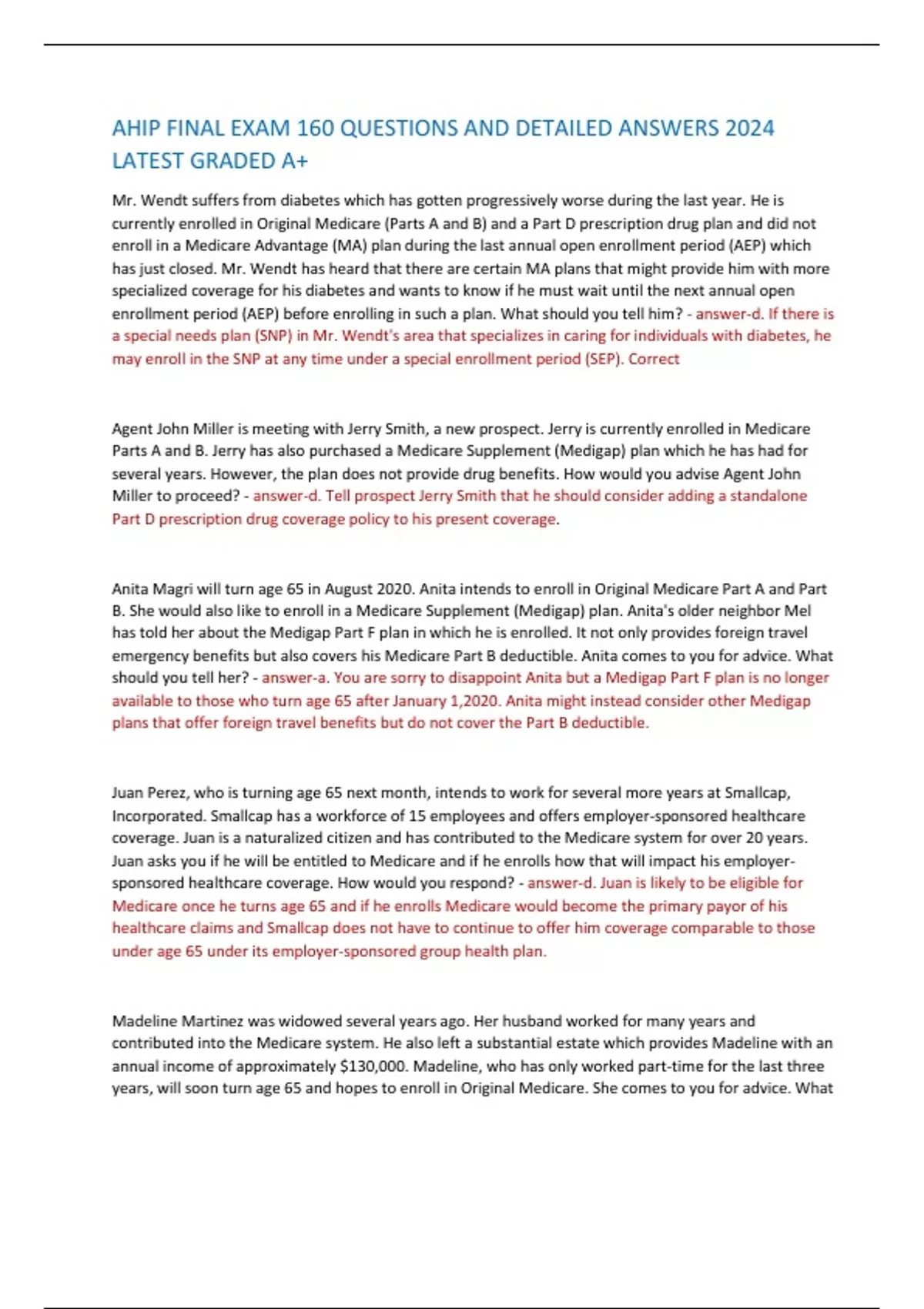AHIP FINAL EXAM 160 QUESTIONS AND DETAILED ANSWERS 2024 LATEST GRADED A+ AHIP FINAL EXAM 160 QUESTIONS AND DETAILED ANSWERS 2024 LATEST GRADED A+ AHIP FINAL EXAM 160 QUESTIONS AND DETAILED ANSWERS 2024 LATEST GRADED A+ AHIP FINAL EXAM 160 QUESTIONS AND DETAILED ANSWERS 2024 LATEST GRADED A+