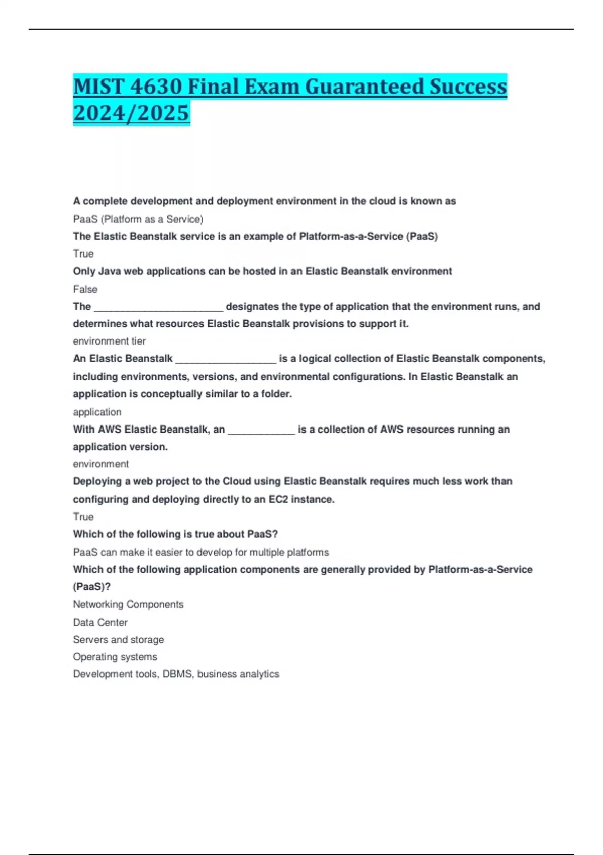 the elastic beanstalk service is an example of pla