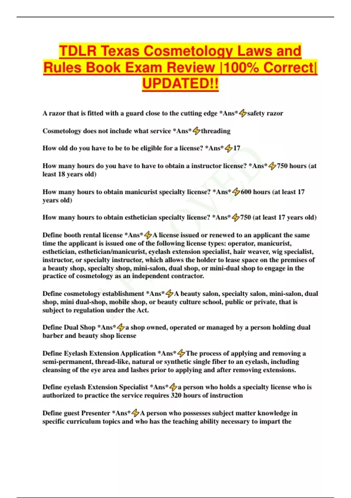 TDLR Texas Cosmetology Laws and Rules Book Exam Review |100% Correct| UPDATED!! A razor that is fitted with a guard close to the cutting edge *Ans* safety razor Cosmetology does not include what service *Ans* threading How old do you have to be to be eligible for a license? *Ans* 17 How many hours do you have to have to obtain a instructor license? *Ans* 750 hours (at least 18 years old) How many hours to obtain manicurist specialty license? *Ans* 600 hours (at least 17 years old) How many hours to obtain esthetician specialty license? *Ans* 750 (at least 17 years old) Define booth rental license *Ans* A license issued or renewed to an applicant the same time the applicant is issued one of the following license types: operator, manicurist, esthetician, esthetician/manicurist, eyelash extension specialist, hair weaver, wig specialist, instructor, or specialty instructor, which allows the holder to lease space on the premises of a beauty shop, specialty shop, mini-salon, dual shop, or mini-dual shop to engage in the practice of cosmetology as an independent contractor. Define cosmetology establishment *Ans* A beauty salon, specialty salon, mini-salon, dual shop, mini dual-shop, mobile shop, or beauty culture school, public or private, that is subject to regulation under the Act. Define Dual Shop *Ans* a shop owned, operated or managed by a person holding dual barber and beauty shop license Define Eyelash Extension Application *Ans* The process of applying and removing a semi-permanent, thread-like, natural or synthetic single fiber to an eyelash, including cleansing of the eye area and lashes prior to applying and after removing extensions. Define eyelash Extension Specialist *Ans* a person who holds a specialty license who is authorized to practice the service requires 320 hours of instruction Define guest Presenter *Ans* A person who possesses subject matter knowledge in specific curriculum topics and who has the teaching ability necessary to impart the information to cosmetology students. Instruction is limited to the presenter's area of expertise and a licensed instructor must be present during the classroom session in order for students to earn hours. Define License by reciprocity *Ans* A process that permits a cosmetology license holder from another jurisdiction or foreign country to obtain a Texas cosmetology license without repeating cosmetology education or examination license requirements. Define Mini Salon *Ans* A cosmetology establishment in which a person practices cosmetology under a license, certificate or permit issued under this chapter and which consists of a room or suite of rooms that is one of a number of connected establishments in a single premises that open onto a common hallway or common area. Define Mini-Dual Shop *Ans* a shop owned, operated, or managed by a person meeting the requirements of both mini barbershop and mini beauty Define mobile shop *Ans* beauty salon, specialty salon, or dual shop that is operated in a self contained,self supporting, enclosed mobile unit Define preparation *Ans* a substance used to beautify a person's face,neck or arms to temporarily remove superfluous hair from a persons body including but not limited to antiseptics, tonics, lotions, powders, oils, Clay's, creams, sugars, waxes. and/or chemicals Define provisional license *Ans* A license that allows a person to practice cosmetology in Texas pending the department's approval or denial of that person's application for licensure by reciprocity. Define Self-Contained *Ans* Containing within itself all that is necessary to be able to operate without connecting to outside utilities such as water and electricity. Special Effect *Ans* includes weddings, quinceanera, paheants, prom, debutante balls. birthday parties, religious and cultural, ceremonies