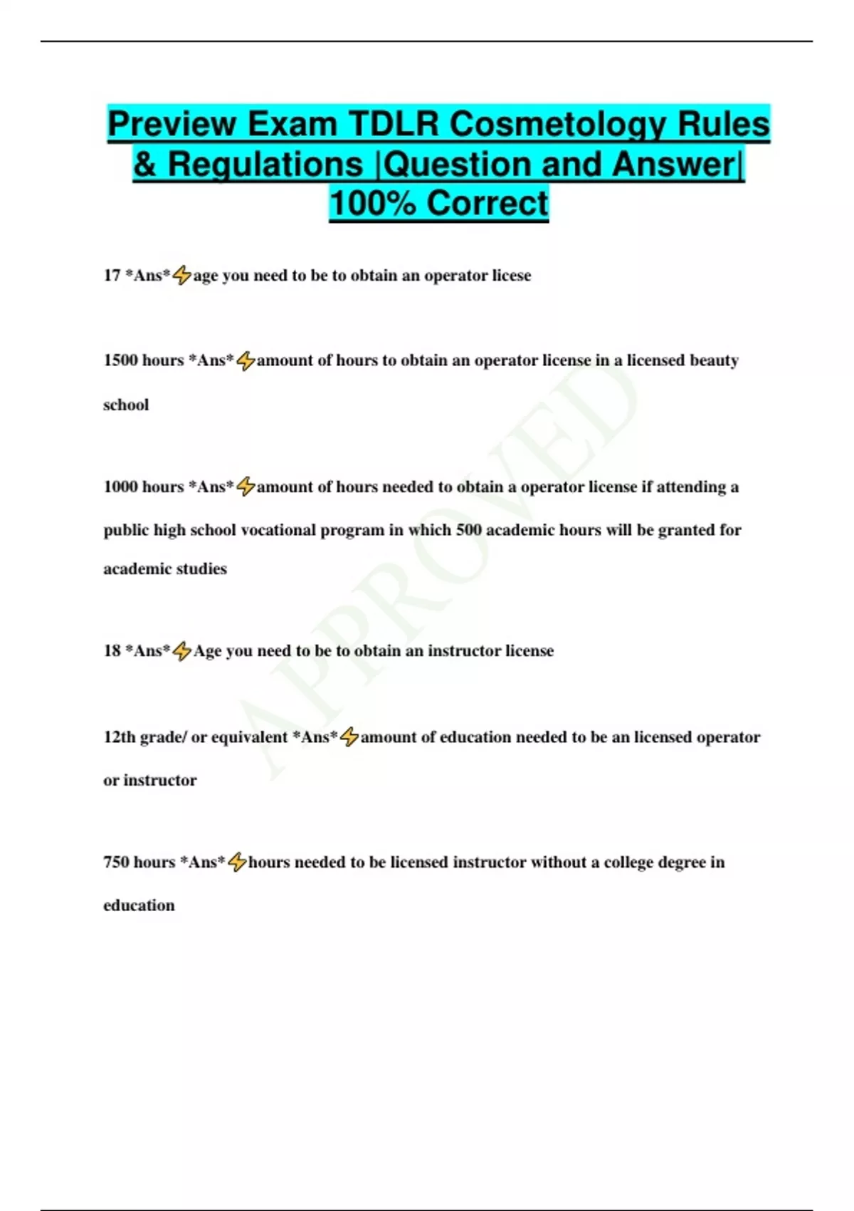 Preview Exam TDLR Cosmetology Rules & Regulations |Question and Answer| 100% Correct 17 *Ans* age you need to be to obtain an operator licese 1500 hours *Ans* amount of hours to obtain an operator license in a licensed beauty school 1000 hours *Ans* amount of hours needed to obtain a operator license if attending a public high school vocational program in which 500 academic hours will be granted for academic studies 18 *Ans* Age you need to be to obtain an instructor license 12th grade/ or equivalent *Ans* amount of education needed to be an licensed operator or instructor 750 hours *Ans* hours needed to be licensed instructor without a college degree in education 500 plus 1 years experience *Ans* hours needed to be a licensed instructor without a college degree in education shampoo apprentice license *Ans* need to be 16 to get one, and it is only valid for 2 years. It may not be renewed. Reciprocal certificate, license, or permit *Ans* a certificate, license or pemit that is transfered from another state or country that has standards of work experience requierments 900 hours *Ans* early examination hour needed for writtne exam 1000 hours *Ans* early examination hours needed for practical exam 2 year *Ans* amount of time an operator licenses is valid before it need to be renewed 1 year *Ans* amount of time a private, public, secondary, post second