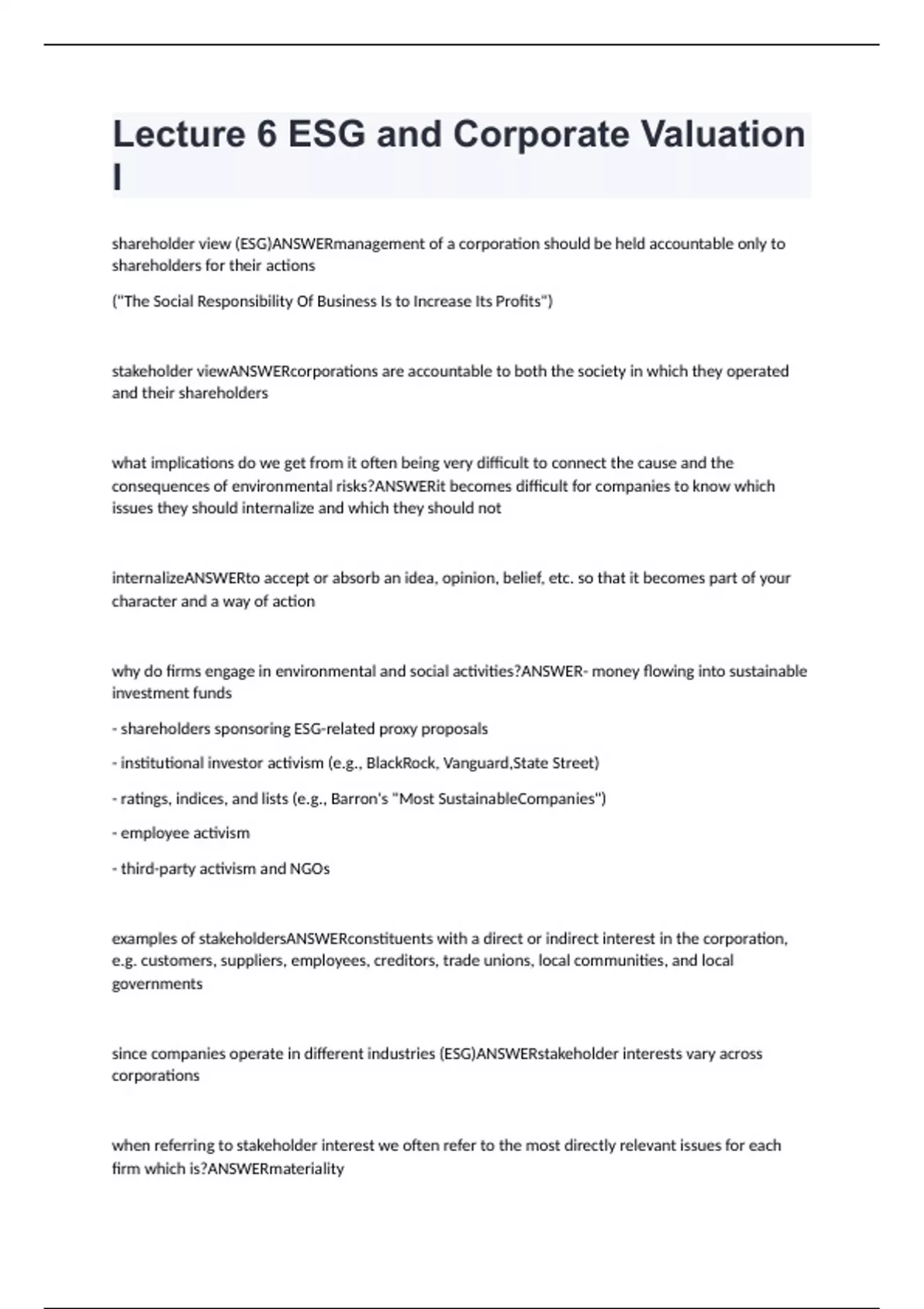 Lecture 6 ESG and Corporate Valuation I Exam Questions And Answers (RATED 100%)