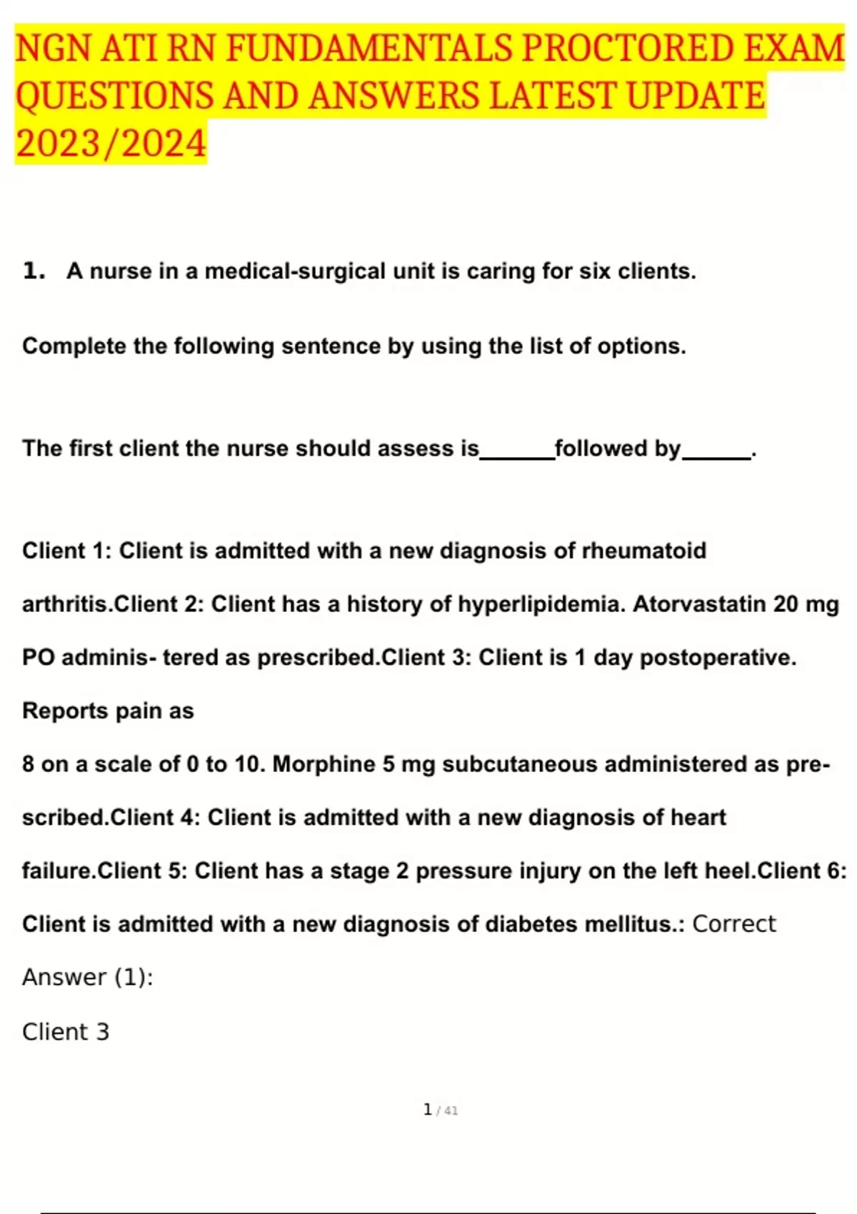 1. A nurse in a medical-surgical unit is caring for six clients. Complete the following sentence by using the list of options. The first client the nurse should assess is followed by . Client 1: Client is admitted with a new diagnosis of rheumatoid arthritis.Client 2: Client has a history of hyperlipidemia. Atorvastatin 20 mg PO adminis- tered as prescribed.Client 3: Client is 1 day postoperative. Reports pain as 8 on a scale of 0 to 10. Morphine 5 mg subcutaneous administered as pre- scribed.Client 4: Client is admitted with a new diagnosis of heart failure.Client 5: Client has a stage 2 pressure injury on the left heel.Client 6: Client is admitted with a new diagnosis of diabetes mellitus.: Correct Answer (1): Client 3 When using the airway, breathing, circulation approach to client care, the nurse should determine that this client is the priority client to assess. The client has an oxygen saturation that is less than the expected reference range, which is an indication of hypoxia. Correct Answer (2): Client 4 When using the airway, breathing, circulation approach to client care, the nurse should determine that this client is the next priority client to assess. The client has a potassium level that is less than the expected reference range, which places the client at risk for dysrhythmias. Incorrect Answers (1): Client 1 is incorrect. The nurse should assess this client because the client's C-re- active protein is greater than the expected reference range, which is an indication of inflammation. However, there is another client the nurse should assess first. Client 2 is incorrect. The nurse should assess this client because the client's cholesterol level is greater than the expected reference range, which places them at risk for coronary heart disease. However, there is another client the nurse should assess first. Incorrect Answers (2): Client 5 is incorrect. The nurse should assess this client because their prealbumin level is less than the expected reference range, which places them at risk for delayed wound healing. However, this client is not the next priority client to assess. Client 6 is incorrect. The nurse should assess this client because their glycosylated hemoglobin level is greater than the expected reference range, which indicates poor diabetic control. However, this client is not the next priority client to assess. 2. A nurse is caring for a client who has COPD. Select the 3 findings that require follow-up. Breath sounds Blood pressure Oxygen saturation Temperature Heart rate: Correct Answer: Breath Sounds Crackles are caused by mucous in the airways and are a manifestation of pneumo- nia. Decreased breath sounds indicate decreased ventilation and require follow-up by the nurse. Oxygen Saturation The client's oxygen saturation is below the expected reference range of 95% to 100%, indicating hypoxia, and requires follow-up by the nurse. Temperature The client's temperature is greater than the expected reference range, indicating an infection, and requires follow-up by the nurse. Incorrect Answer: Blood pressure is incorrect. The client's blood pressure is within the expected reference range and does not require follow-up by the nurse. Heart rate is incorrect. The client's heart rate is within the expected reference range of 60 to 100/min and does not require follow-up by the nurse. 3. A nurse in the emergency department (ED) is caring for a client who reports abdominal pain. Based on the client's clinical findings, which of the following actions should the nurse take? Select all that apply. Assist the client to a left side-lying position with the right knee flexed. Prepare the client for a chest x-ray. Administer a cleansing enema. Auscultate the client's bowel sounds. Perform a manual digital examination of the client's rectum. Administer oxycodone extended-release tablets. Prepare the client for NG tube placement.: Correct Answer: Assist the client to a left side-lying position with the right knee flexed The nurse should place the client in a left side-lying position with the right knee flexed prior to administering an enema. Because the provider prescribed a cleansing enema for the client, the nurse should prepare the client for the procedure. Administer a cleansing enema The nurse should administer a cleansing enema for the client as a result of the provider's prescription. A cleansing enema is intended to assist with bowel elimina- tion and remove any impacted fecal matter indicated by the abdominal x-ray. Auscultate the client's bowel sounds The nurse should auscultate the client's bowel sounds to determine the status of the client's peristalsis. This is a necessary part of determining the presence of bowel sounds, which are an indication of the status of the client's gastrointestinal tract. Perform a manual digital examination of the client's rectum The nurse should perform a manual digital examination of the client's rectum to determine if impacted stool is present. This is a part of the necessary evaluation of the status of the client's gastrointestinal tract. Incorrect Answer: Prepare the client for a chest x-ray is incorrect. A chest x-ray is typically performed for a client who has an impairment of the upper thorax or lungs, not the abdomen. The client has already received an abdominal x-ray; therefore, a chest x-ray is not necessary. Prepare the client for NG tube placement is incorrect. The nurse should not prepare the client for placement of an NG tube because there is no indication or prescription to do so. Placement of an NG tube is required when there is an obstruction of the gastrointestinal tract and peristalsis is absent. 4. A nurse is caring for a client who asks about the purpose of advance directives. Which of the following statements should the nurse make? "They allow the court to overrule an adult client's refusal of medical treat- ment." "They indicate the form of treatment a client is willing to accept in the event of a serious illness." "They 