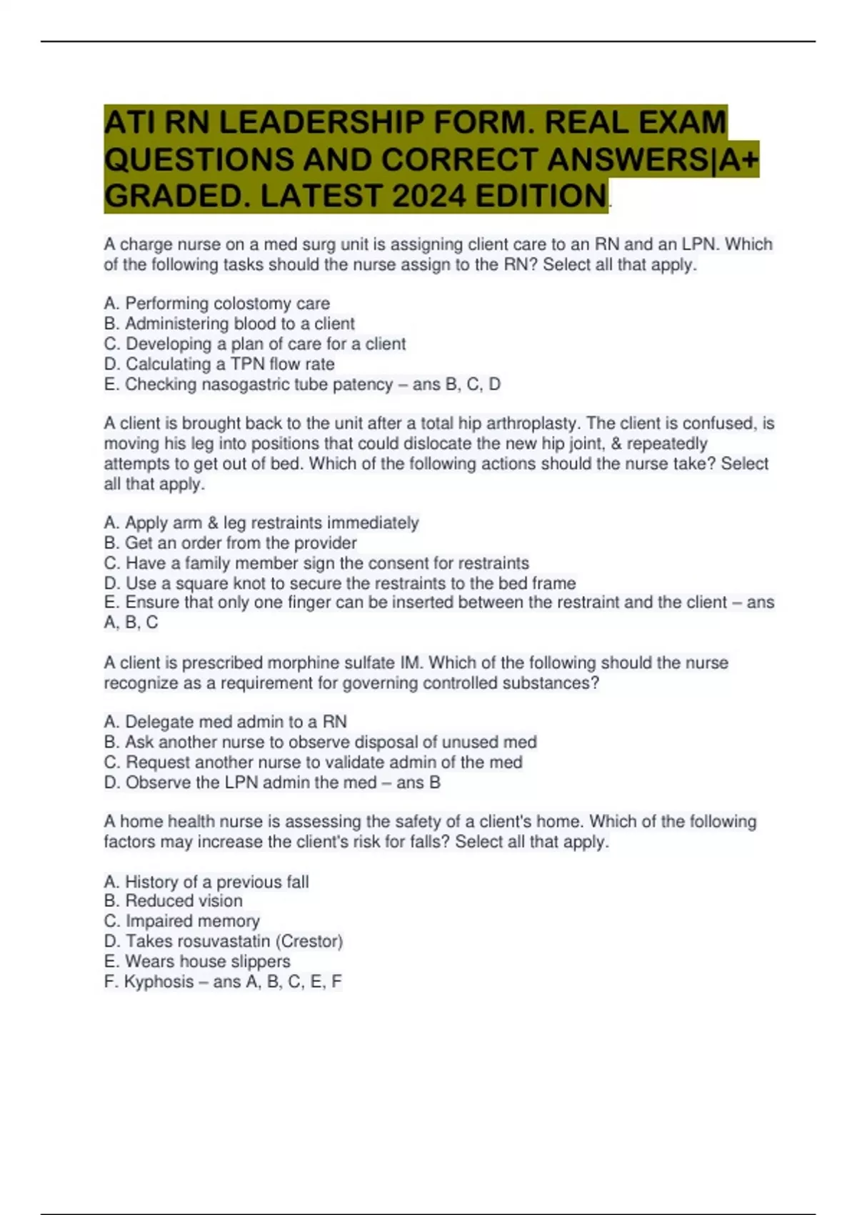 ATI RN LEADERSHIP FORM. REAL EXAM QUESTIONS AND CORRECT ANSWERS|A+ GRADED. LATEST 2024 EDITION