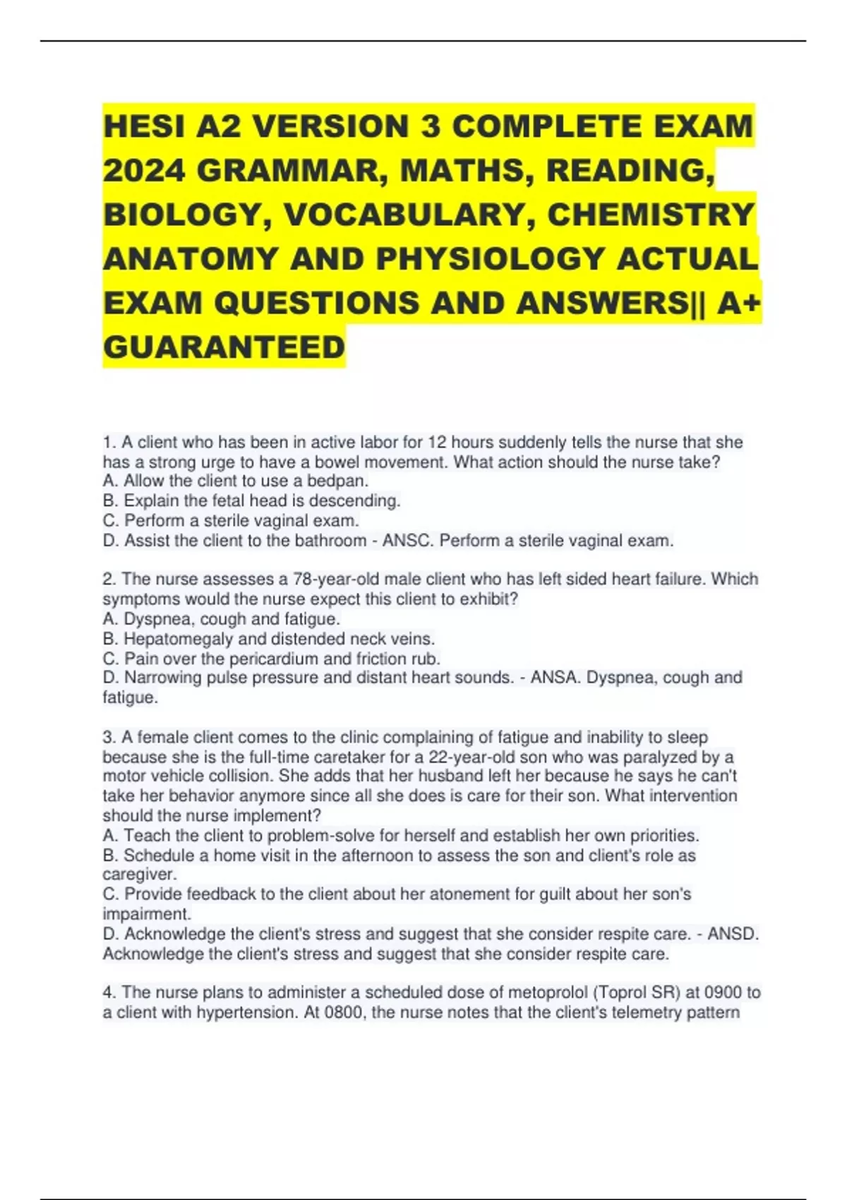 HESI A2 VERSION 3 COMPLETE EXAM 2024 GRAMMAR, MATHS, READING, BIOLOGY, VOCABULARY, CHEMISTRY ANATOMY AND PHYSIOLOGY ACTUAL EXAM QUESTIONS AND ANSWERS|| A+ GUARANTEED