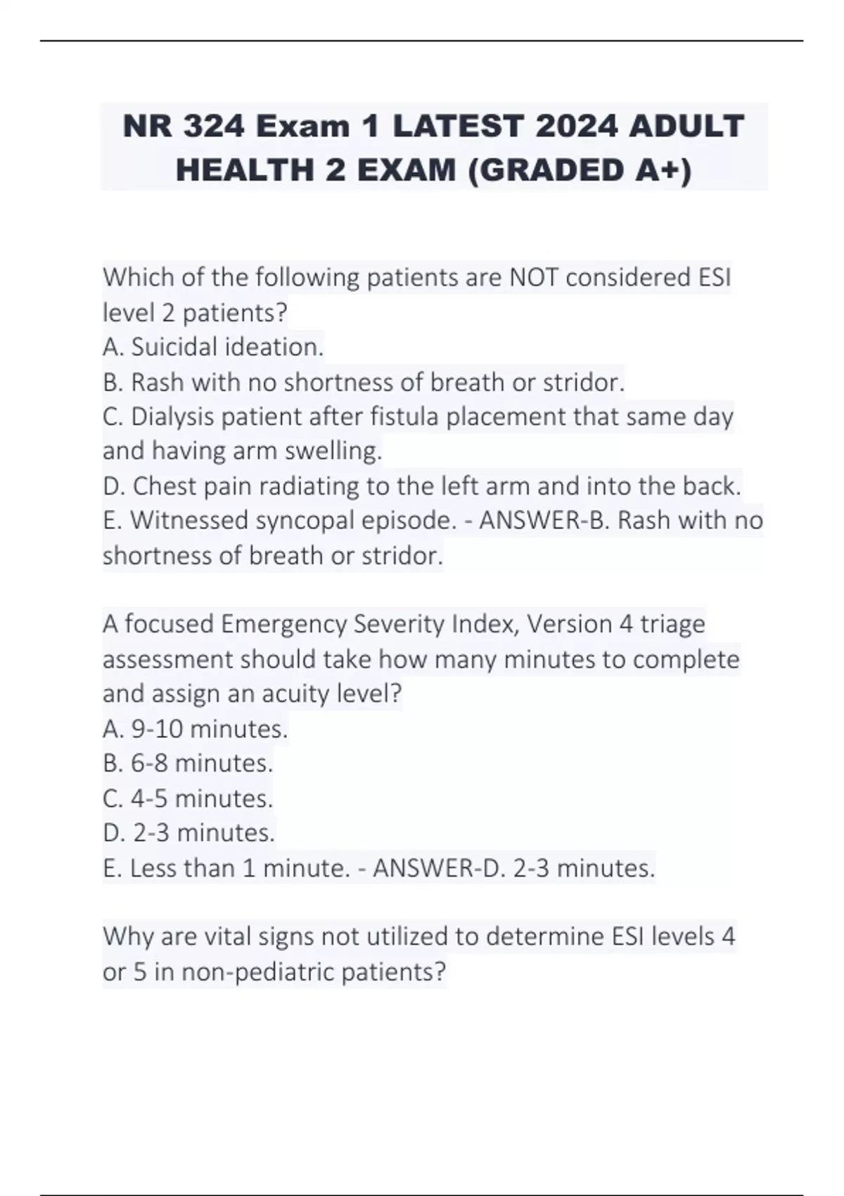 NR 324 Exam 1 LATEST 2024 ADULT HEALTH 2 EXAM (GRADED A+)