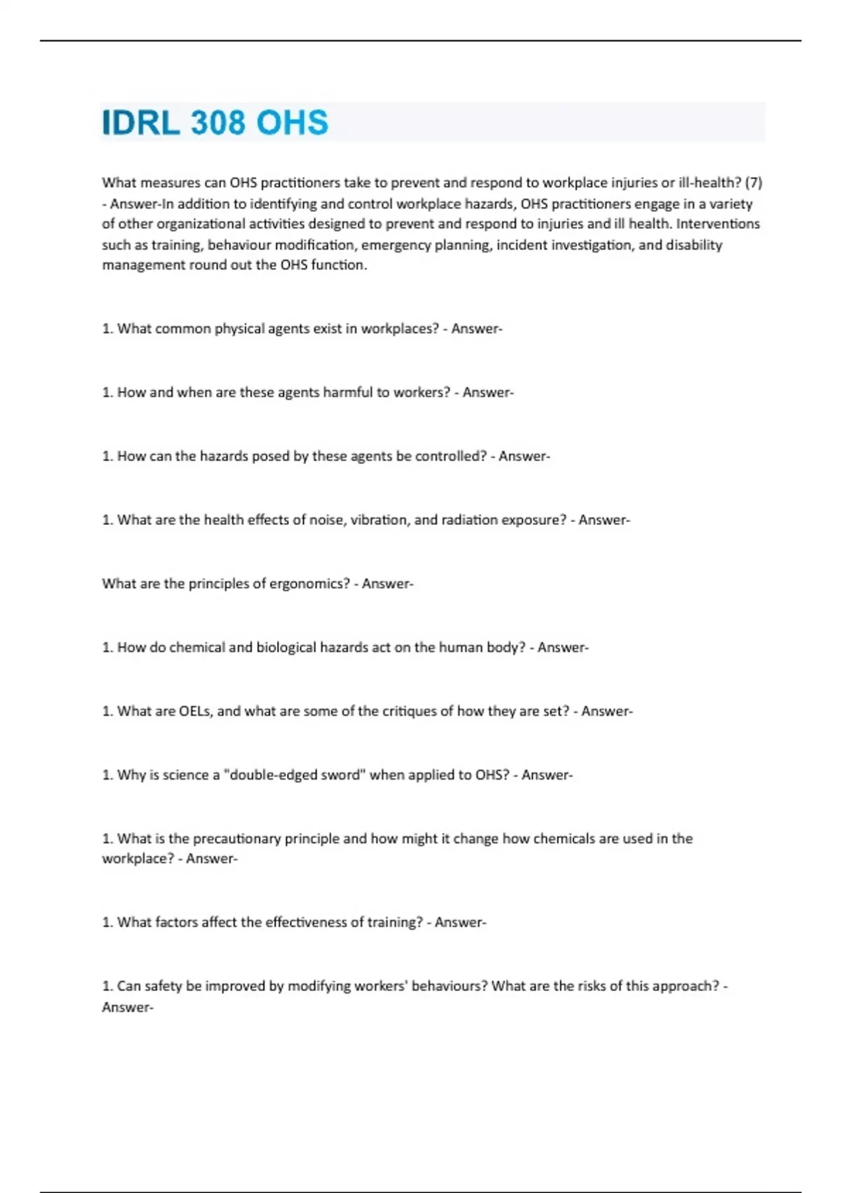 IDRL 308 OHS Questions And Answers With Verified Study Solutions