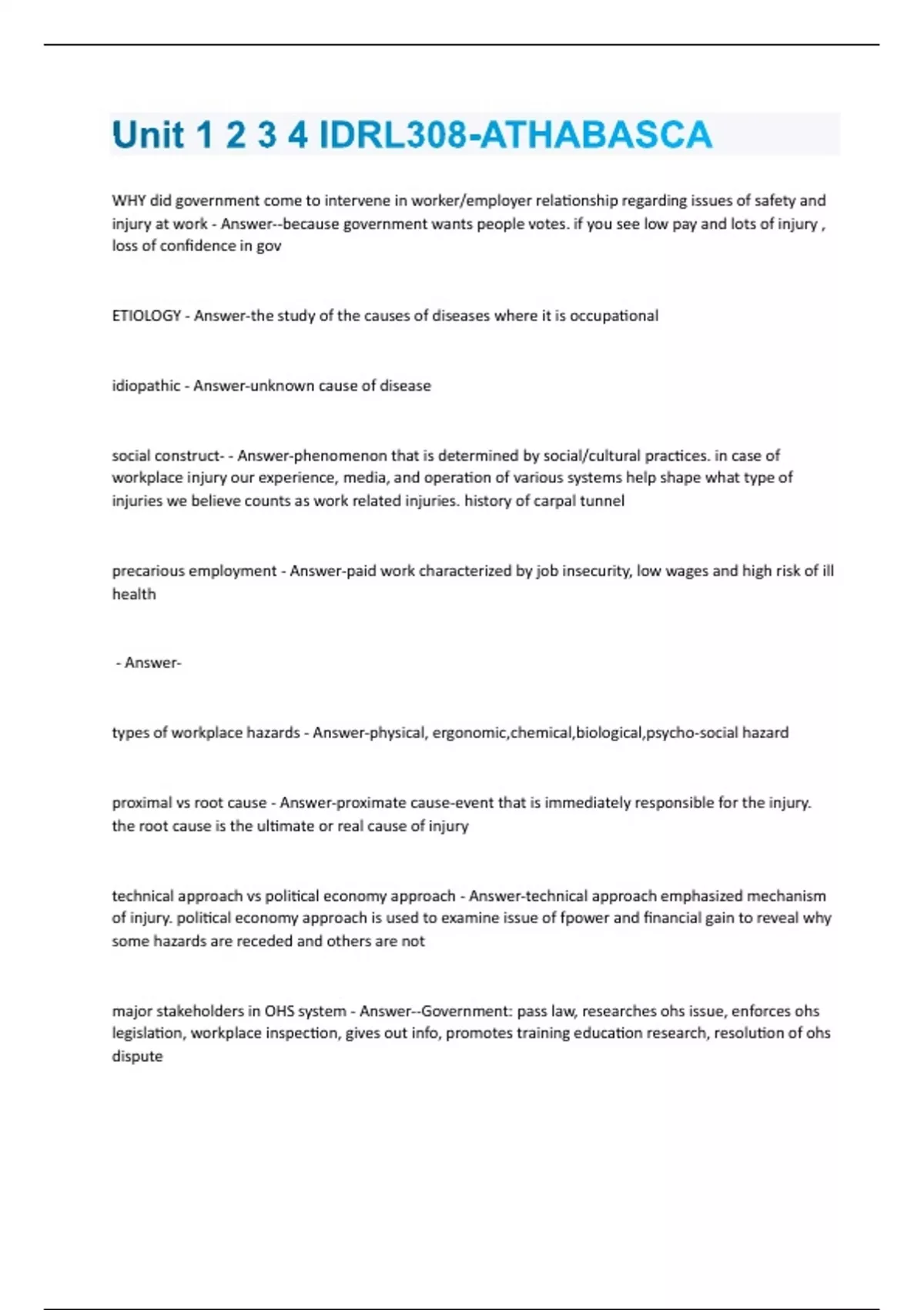 Unit 1 2 3 4 IDRL308-ATHABASCA test (Questions + Answers) Solved