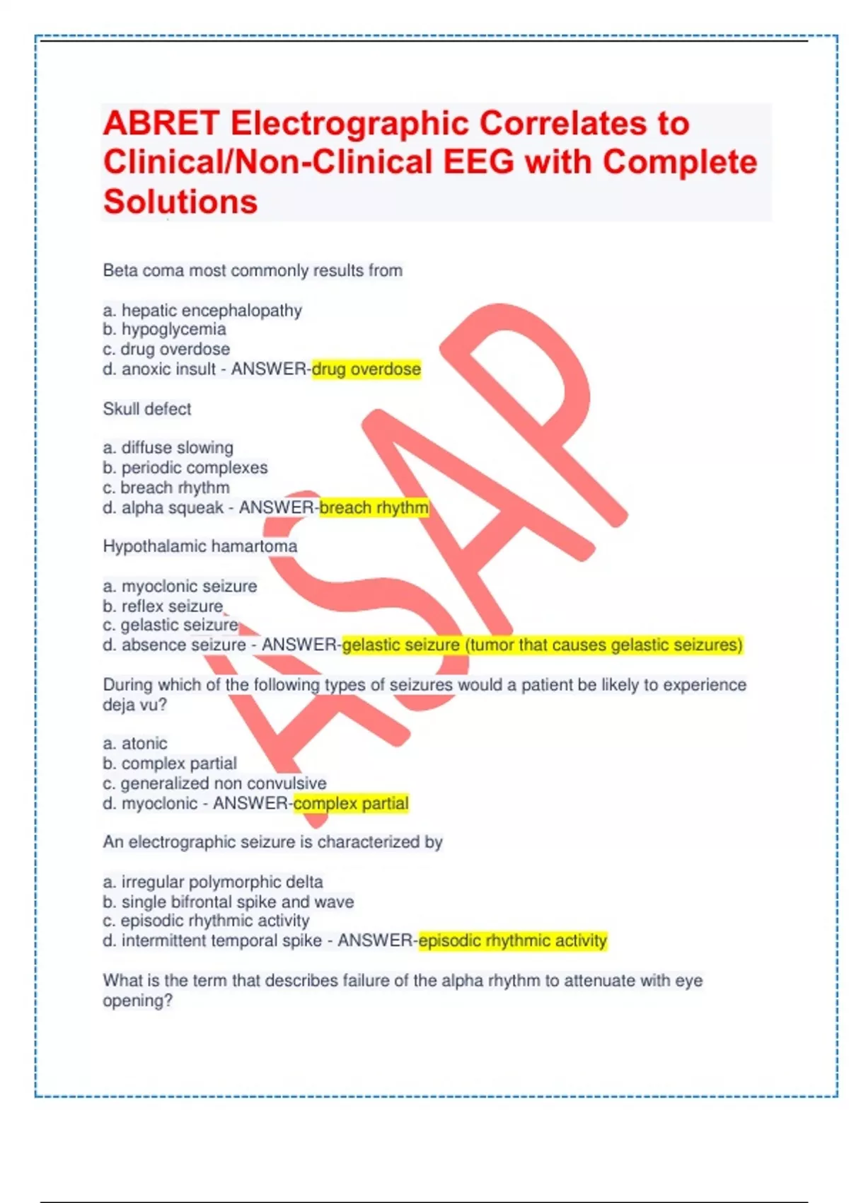 Beta coma most commonly results from a. hepatic encephalopathy b. hypoglycemia c. drug overdose d. anoxic insult - ANSWER-drug overdose Skull defect a. diffuse slowing b. periodic complexes c. breach rhythm d. alpha squeak - ANSWER-breach rhythm Hypothalamic hamartoma a. myoclonic seizure b. reflex seizure c. gelastic seizure d. absence seizure - ANSWER-gelastic seizure (tumor that causes gelastic seizures) During which of the following types of seizures would a patient be likely to experience deja vu? a. atonic b. complex partial c. generalized non convulsive d. myoclonic - ANSWER-complex partial