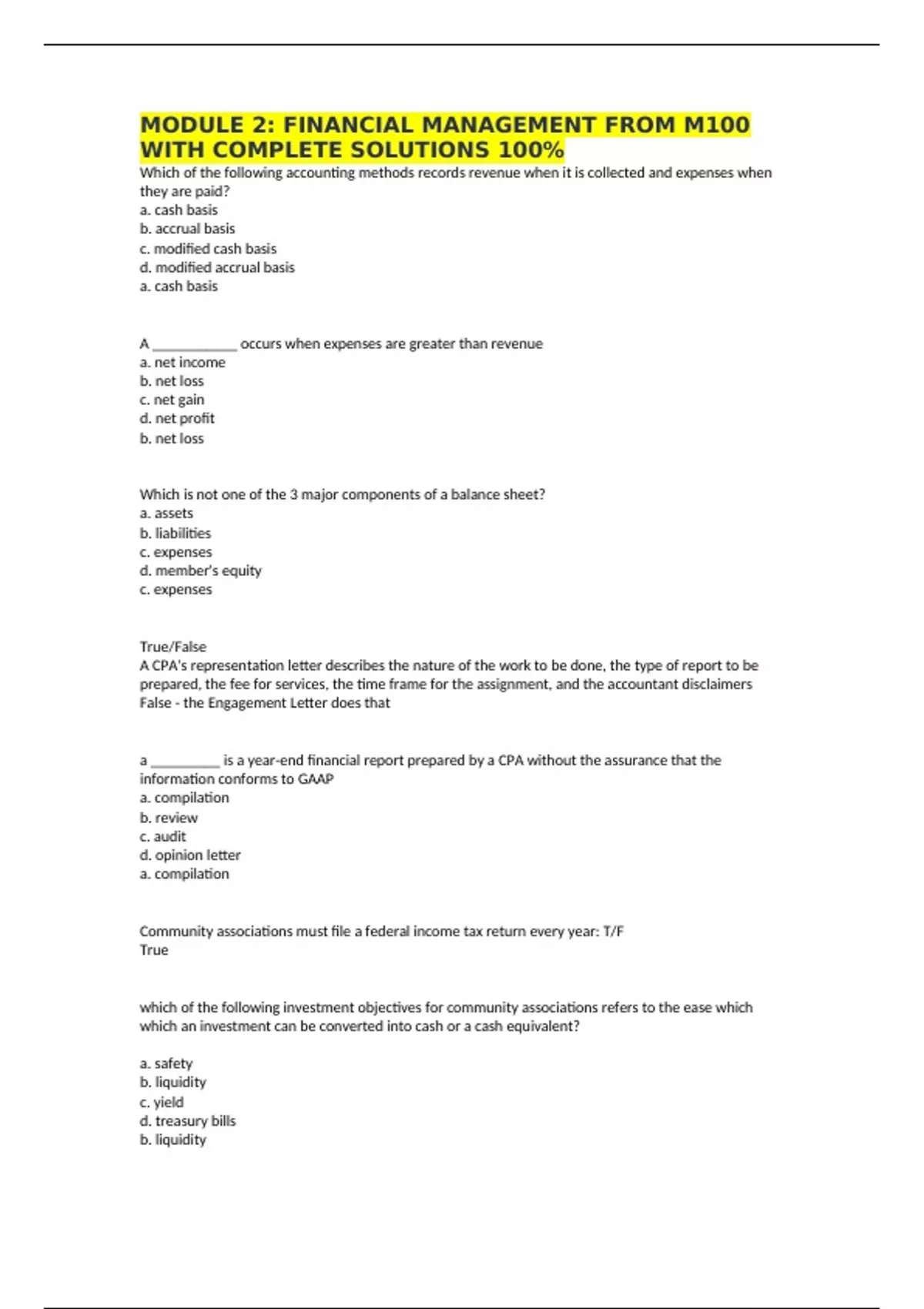 MODULE 2: FINANCIAL MANAGEMENT FROM M100 WITH COMPLETE SOLUTIONS 100% Which of the following accounting methods records revenue when it is collected and expenses when they are paid? a. cash basis b. accrual basis c. modified cash basis d. modified accrual basis a. cash basis A ___________ occurs when expenses are greater than revenue a. net income b. net loss c. net gain d. net profit b. net loss Which is not one of the 3 major components of a balance sheet? a. assets b. liabilities c. expenses d. member's equity c. expenses True/False A CPA's representation letter describes the nature of the work to be done, the type of report to be prepared, the fee for services, the time frame for the assignment, and the accountant disclaimers False - the Engagement Letter does that a _________ is a year-end financial report prepared by a CPA without the assurance that the information conforms to GAAP a. compilation b. review c. audit d. opinion letter a. compilation Community associations must file a federal income tax return every year: T/F True which of the following investment objectives for community associations refers to the ease which which an investment can be converted into cash or a cash equivalent? a. safety b. liquidity c. yield d. treasury bills b. liquidity