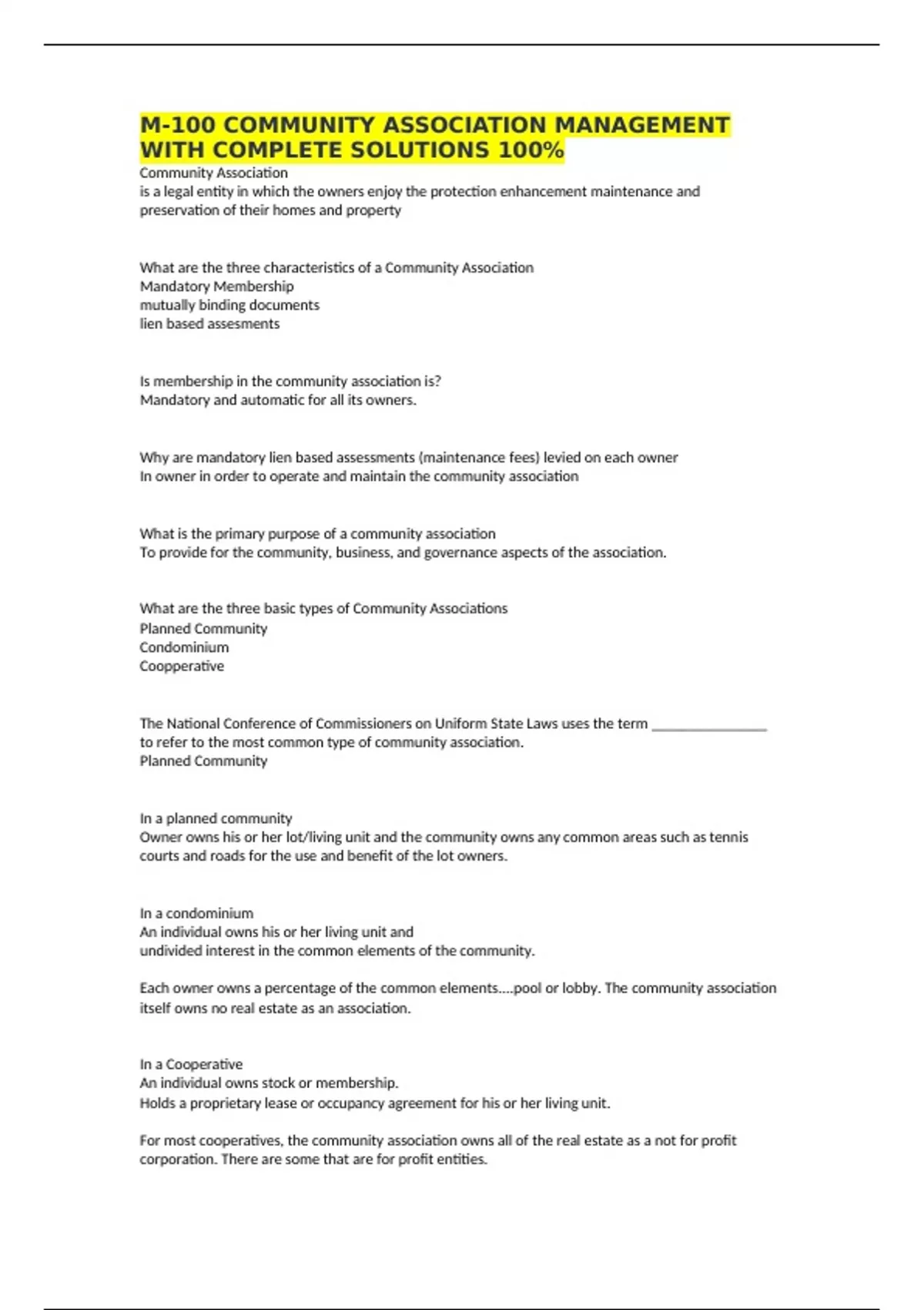 M-100 COMMUNITY ASSOCIATION MANAGEMENT WITH COMPLETE SOLUTIONS 100% Community Association is a legal entity in which the owners enjoy the protection enhancement maintenance and preservation of their homes and property What are the three characteristics of a Community Association Mandatory Membership mutually binding documents lien based assesments Is membership in the community association is? Mandatory and automatic for all its owners. Why are mandatory lien based assessments (maintenance fees) levied on each owner In owner in order to operate and maintain the community association What is the primary purpose of a community association To provide for the community, business, and governance aspects of the association. What are the three basic types of Community Associations Planned Community Condominium Coopperative The National Conference of Commissioners on Uniform State Laws uses the term _______________ to refer to the most common type of community association. Planned Community In a planned community Owner owns his or her lot/living unit and the community owns any common areas such as tennis courts and roads for the use and benefit of the lot owners. In a condominium An individual owns his or her living unit and undivided interest in the common elements of the community. Each owner owns a percentage of the common elements....pool or lobby. The community association itself owns no real estate as an association. In a Cooperative An individual owns stock or membership. Holds a proprietary lease or occupancy agreement for his or her living unit. For most cooperatives, the community association owns all of the real estate as a not for profit corporation. There are some that are for profit entities.