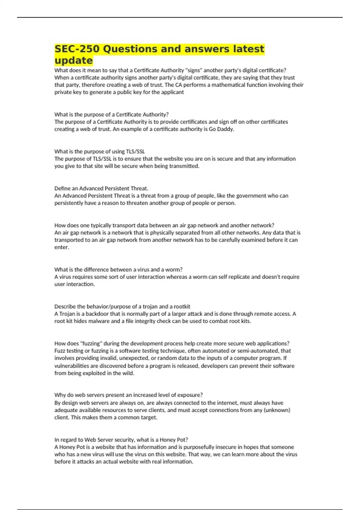 SEC-250 Questions and answers latest update What does it mean to say that a Certificate Authority "signs" another party's digital certificate? When a certificate authority signs another party's digital certificate, they are saying that they trust that party, therefore creating a web of trust. The CA performs a mathematical function involving their private key to generate a public key for the applicant What is the purpose of a Certificate Authority? The purpose of a Certificate Authority is to provide certificates and sign off on other certificates creating a web of trust. An example of a certificate authority is Go Daddy. What is the purpose of using TLS/SSL The purpose of TLS/SSL is to ensure that the website you are on is secure and that any information you give to that site will be secure when being transmitted. Define an Advanced Persistent Threat. An Advanced Persistent Threat is a threat from a group of people, like the government who can persistently have a reason to threaten another group of people or person. How does one typically transport data between an air gap network and another network? An air gap network is a network that is physically separated from all other networks. Any data that is transported to an air gap network from another network has to be carefully examined before it can enter. What is the difference between a virus and a worm? A virus requires some sort of user interaction whereas a worm can self replicate and doesn't require user interaction. Describe the behavior/purpose of a trojan and a rootkit A Trojan is a backdoor that is normally part of a larger attack and is done through remote access. A root kit hides malware and a file integrity check can be used to combat root kits. How does "fuzzing" during the development process help create more secure web applications? Fuzz testing or fuzzing is a software testing technique, often automated or semi-automated, that involves providing invalid, unexpected, or random data to the inputs of a computer program. If vulnerabilities are discovered before a program is released, developers can prevent their software from being exploited in the wild. Why do web servers present an increased level of exposure? By design web servers are always on, are always connected to the internet, must always have adequate available resources to serve clients, and must accept connections from any (unknown) client. This makes them a common target. In regard to Web Server security, what is a Honey Pot? A Honey Pot is a website that has information and is purposefully insecure in hopes that someone who has a new virus will use the virus on this website. That way, we can learn more about the virus before it attacks an actual website with real information. Why would an organization use an application-level filter to inspect all outgoing mail as well as incoming? An organization might want to look for incoming spam phishing attempts, scan incoming mail for viruses, or monitor outgoing mail to detect an infected mail server. Describe the difference between a stateless and a stateful packet filter: A stateless packet filter looks at incoming and outgoing packets and accepts or denies packets based on criteria like source and destination IP address, Protocol, or Port number. It does not compare packets to any previous packets that have traversed the firewall. A stateful packet filter can monitor a session between an internal host and an external server. It can allow response packets from external servers based on an pre-established session. What is a Cross Site Scripting attack? XSS attacks web Bad code. If the text inputted by the user is reflected back and has not been data validated (or sanitized) the browser will interpret the inputted script as part of the mark up and execute the code accordingly. An XSS attack consists of an attacker taking advantage of this. Describe a SQL injection attack An SQL injection attack is when a hacker tries to get information from a database by using a web form. You can run SQL commands to get certain information. Commonly a hacker's goal is to reach the point where they can execute 'arbitrary code' on a remote system. What exactly does 'arbitrary code' mean? 'Arbitrary code' refers to an attacker's ability to run any command they choose. This implies that they have root or administrator level access. What does non-repudiation mean? How are digital signatures used in repudiation disputes? Non-repudiation is 'an authentication that can be asserted to be genuine with high assurance', meaning we can believe beyond a reasonable doubt that an individual did something and they are unable to deny it. By digitally signing a document, others can use our public key to verify beyond a reasonable doubt that we created the document. What is a logic bomb? A logic bomb is any code that is set to execute when a certain condition or event transpires in the future. They are often employed by criminals to hide their tracks in the case that they're caught. How does a DNS amplification attack work? An attacker sends a small request to a public DNS server soliciting a large amount of data in response. The attacker supplies a sources address of its victim so that the size-amplified reply packets are sent to the victim, possibly creating a Denial of Service condition. Describe AAA Authentication is how you identity yourself with something you know(a password), something you have(a key card or smart card) or something you are(your fingerprint or retina). Authorization is making sure that only the people that need to have and see certain information are authorized to do so whereas people who shouldn't have access to it, can't. Accounting is keeping of logs and records of things like smart card swipes. Block vs Stream Cipher Block cipher - Break text into relatively large chunks and encode each block separately. Stream cipher - partition the text into small blocks and let the encoding of each block depend on many previous blocks. Describ