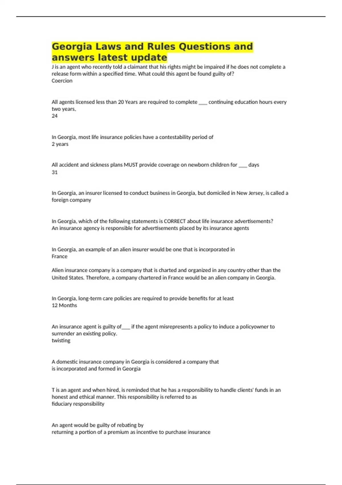 Georgia Laws and Rules Questions and answers latest update J is an agent who recently told a claimant that his rights might be impaired if he does not complete a release form within a specified time. What could this agent be found guilty of? Coercion All agents licensed less than 20 Years are required to complete ___ continuing education hours every two years, 24 In Georgia, most life insurance policies have a contestability period of 2 years All accident and sickness plans MUST provide coverage on newborn children for ___ days 31 In Georgia, an insurer licensed to conduct business in Georgia, but domiciled in New Jersey, is called a foreign company In Georgia, which of the following statements is CORRECT about life insurance advertisements? An insurance agency is responsible for advertisements placed by its insurance agents In Georgia, an example of an alien insurer would be one that is incorporated in France Alien insurance company is a company that is charted and organized in any country other than the United States. Therefore, a company chartered in France would be an alien company in Georgia. In Georgia, long-term care policies are required to provide benefits for at least 12 Months An insurance agent is guilty of___ if the agent misrepresents a policy to induce a policyowner to surrender an existing policy. twisting A domestic insurance company in Georgia is considered a company that is incorporated and formed in Georgia T is an agent and when hired, is reminded that he has a responsibility to handle clients' funds in an honest and ethical manner. This responsibility is referred to as fiduciary responsibility An agent would be guilty of rebating by returning a portion of a premium as incentive to purchase insurance Using an existing life insurance policy's cash value to purchase another policy with with same insurer for the sole purpose of earning additional commissions is called Churning An agent must have ___ hours of ethics per continuing education reporting period 3 Convincing a prospective insured to buy an insurance policy based on exaggerations is called misrepresentation In Georgia, which of the following is considered an Unfair Trade Practice Coercion In the state of Georgia, every policyowner must be offered which of the following free-look period The purpose of the Rules Governing Advertisement of Life Insurance and Annuities is to assure full disclosure to the public of all material and relevant information Under which circumstance may the Commissioner of Insurance suspend, revoke, or refuse to renew the license of an agent Agent is found guilty of misrepresentation in obtaining the license An example of an unfair claims settlement practice is turning down a claim without providing the basis of denial Which document MUST accompany an application that initiates the replacement of an existing life insurance policy A signed statement by the applicant regarding the replacement A producer must notify the Commissioner within___ days of an address change 30 As a condition for a loan, a bank requires the borrower to purchase credit insurance from a specific company. What is the bank guilty of? Coercion Which of the following correctly describes a certificate of authority? Permits an insurance company to transact business in Georgia An example of an unfair claims practice would be failing to effectuate prompt, fair, and equitable settlements of a claim When the Commission examines an insurer's records, who pays for the costs associated with the examination? The insurance company being examined The Life and Health Insurance Guaranty Association is funded by admitted insurance companies through assessments J is an agent who has induced an insured through misrepresentation to surrender an existing insurance policy. What is J guilty of? Twisting Who owns a stock company? its stockholders Which of the following is the MINIMUM age at which an individual can sign a life insurance application? 15 Which of these is NOT a requirement to obtain an insurance agent license in Georgia Graduate High School Insurance agent licenses normally must be renewed every ___ years in Georgia 2 What would be an accurate definition of "controlled business"? Insurance business that is written on the agent's own life, property, or interests What is the purpose of the Life and Health Insurance Guaranty Association Protects policyowners against insolvent insurance companies The coordination of benefits (COB) provision exists in order to avoid duplication of benefits payments Before an insurance company can pay commissions to an agent, the agent must be licensed and appointed Upon reaching the limiting age, a handicapped child can extend their health insurance coverage as a dependent only if the child is incapable of employment and chiefly dependent on the policyowner An example of rebating would be offering a client something of value not stated in the contract in exchange for their business