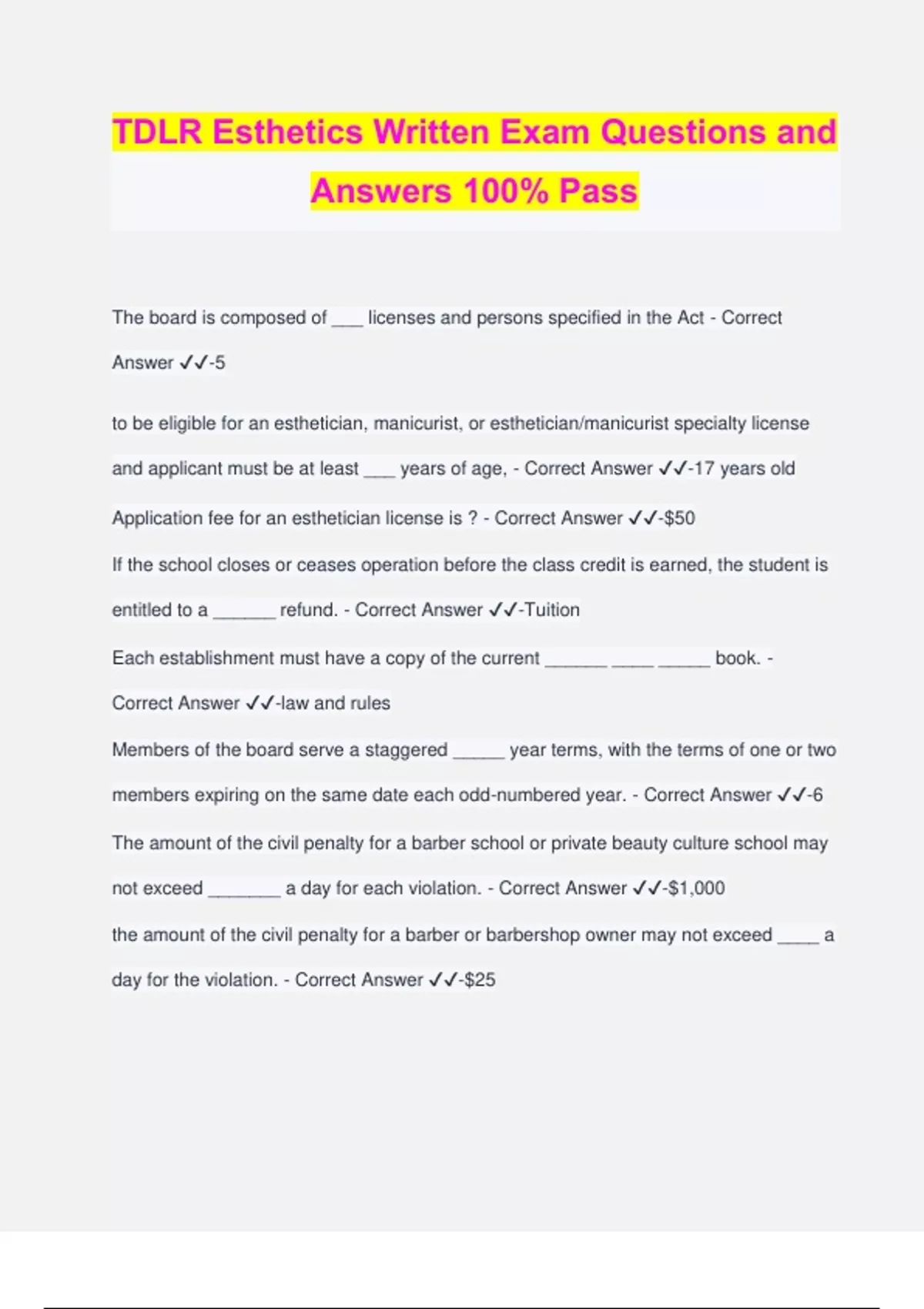 TDLR Esthetics Written Exam Questions and Answers 100% Pass The board is composed of ___ licenses and persons specified in the Act - Correct Answer ️️ -5 to be eligible for an esthetician, manicurist, or esthetician/manicurist specialty license and applicant must be at least ___ years of age, - Correct Answer ️️ -17 years old Application fee for an esthetician license is ? - Correct Answer ️️ -$50 If the school closes or ceases operation before the class credit is earned, the student is entitled to a ______ refund. - Correct Answer ️️ -Tuition Each establishment must have a copy of the current ______ ____ _____ book. - Correct Answer ️️ -law and rules Members of the board serve a staggered _____ year terms, with the terms of one or two members expiring on the same date each odd-numbered year. - Correct Answer ️️ -6 The amount of the civil penalty for a barber school or private beauty culture school may not exceed _______ a day for each violation. - Correct Answer ️️ -$1,000 the amount of the civil penalty for a barber or barbershop owner may not exceed ____ a day for the violation. - Correct Answer ️️ -$25 if the department determines that it lacks jurisdiction to resolve a complaint, the department shall notify the complainant in ________ that the department is closing the complaint because it lacks jurisdiction. - Correct Answer ️️ -writing the use of any product, preparation or procedure that comes into contact with tor penetrates the dermis layer of the skin is_________. - Correct Answer ️️ - PROHIBITED ; NOT ALLOWED The spa system shall be flushed with soap and water for atleast _____, after which the spa shall be rinsed and drained. - Correct Answer ️️ -10 minutes Licensed facility means? - Correct Answer ️️ -the premises of a place of business that holds a license, certificate or permit under the Texas Occupations Code. For bodily fluid cleanup and disinfection, add ___ household (5.25%) bleach to one gallon water. - Correct Answer ️️ -1 cup and 3/4 What is cleanup and disinfection solution called? - Correct Answer ️️ -10% bleach solution The commission may only require a license holder to complete continuing of not more than __ hours in health and safety courses if the license holder is atleast 65 years of age. - Correct Answer ️️ -4 Which nerves convey impulses from the brain or spinal cord to the muscles or glands? - Correct Answer ️️ -motor Eccrine glands are ___. - Correct Answer ️️ -sweat glands What is hydrolipidic film? - Correct Answer ️️ -oil-water balance that protects the