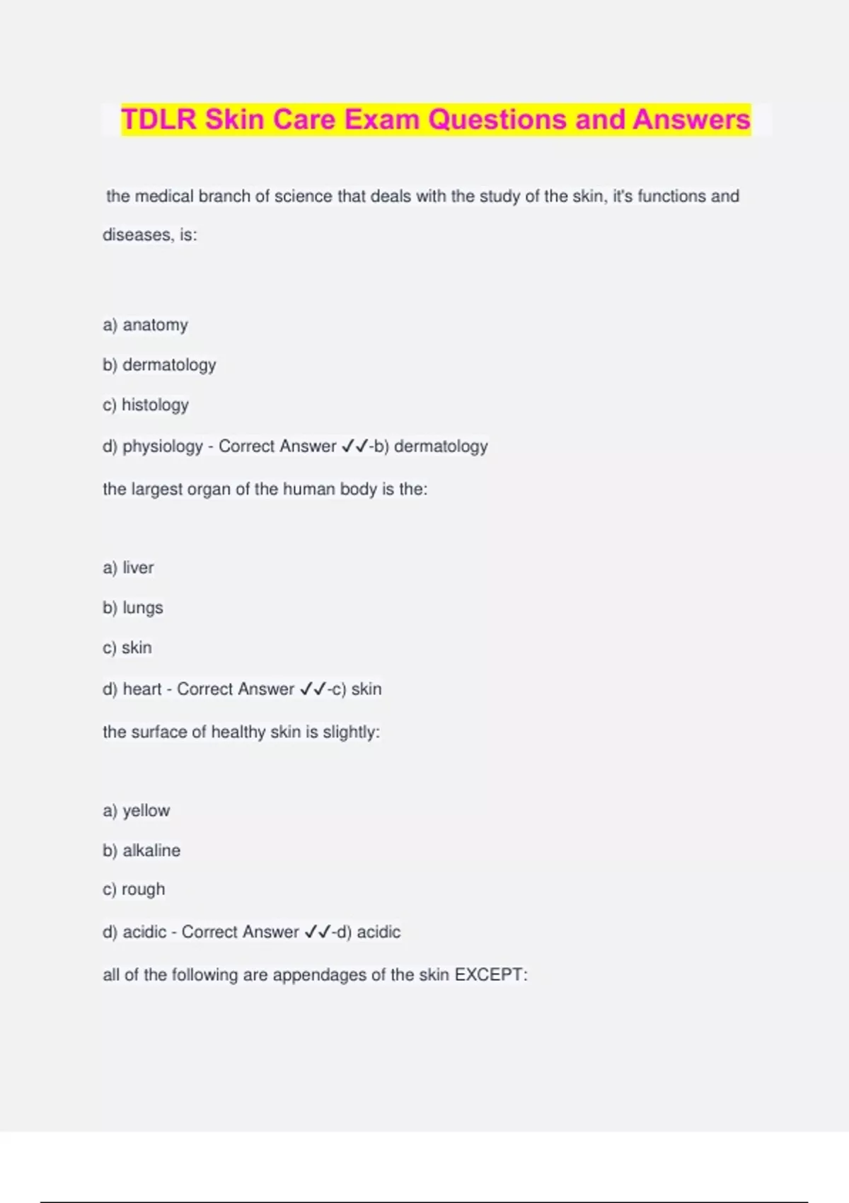 TDLR Skin Care Exam Questions and Answers the medical branch of science that deals with the study of the skin, it's functions and diseases, is: a) anatomy b) dermatology c) histology d) physiology - Correct Answer ️️ -b) dermatology the largest organ of the human body is the: a) liver b) lungs c) skin d) heart - Correct Answer ️️ -c) skin the surface of healthy skin is slightly: a) yellow b) alkaline c) rough d) acidic - Correct Answer ️️ -d) acidic all of the following are appendages of the skin EXCEPT: a) pineal gland b) nails c) sebaceous glands d) hair - Correct Answer ️️ -a) pineal gland continued pressure on any part of the skin causes it to thicken and develop into a(n): a) lesion b) appendage c) scar d) callus - Correct Answer ️️ -d) callus the outermost and thinnest layer of the skin is the: a) subcutaneous b) surface c) epidermis d) dermis - Correct Answer ️️ -c) epidermis the epidermis layer of the skin is also known as the: a) papillary layer b) cuticle layer c) subcutaneous layer d) dermis layer - Correct Answer ️️ -b) cuticle layer the layer of the skin that we see and is treated by the practitioner is the: a) corneum b) keratin c) melanin d) spinosum - Correct Answer ️️ -a) corneum the clear, transparent layer just under the stratum corneum that consists of small cells through which light can pass is the: a) stratum lucidum b) stratum corneum c) stratum spinosum d) stratum granulosum - Correct Answer ️️ -a) stratum lucidum the deepest layer of the epidermis, the basal cell layer, is also known as the: a) stratum spinosum b) stratum germinativum c) stratum corneum d) keratin dermis - Correct Answer ️️ -b) stratum germinativum the stratum germinativum is composed of several layers with special cells that produce a dark skin pigment called: a) keratin b) elongated c) melanin d) granules - Correct Answer ️️ -c) melanin the underlying or inner layer of the skin, which is also called ther der