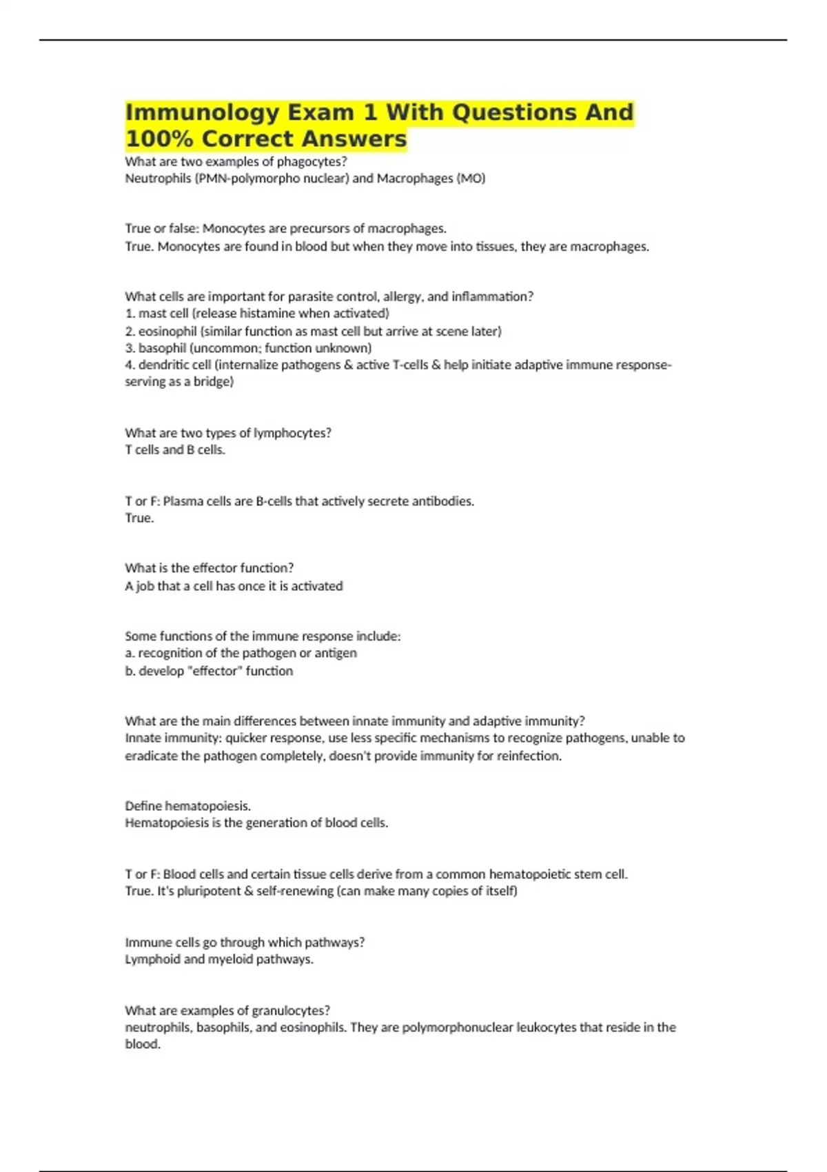 Immunology Exam 1 With Questions And 100% Correct Answers What are two examples of phagocytes? Neutrophils (PMN-polymorpho nuclear) and Macrophages (MO) True or false: Monocytes are precursors of macrophages. True. Monocytes are found in blood but when they move into tissues, they are macrophages. What cells are important for parasite control, allergy, and inflammation? 1. mast cell (release histamine when activated) 2. eosinophil (similar function as mast cell but arrive at scene later) 3. basophil (uncommon; function unknown) 4. dendritic cell (internalize pathogens & active T-cells & help initiate adaptive immune response-serving as a bridge) What are two types of lymphocytes? T cells and B cells. T or F: Plasma cells are B-cells that actively secrete antibodies. True. What is the effector function? A job that a cell has once it is activated Some functions of the immune response include: a. recognition of the pathogen or antigen b. develop "effector" function What are the main differences between innate immunity and adaptive immunity? Innate immunity: quicker response, use less specific mechanisms to recognize pathogens, unable to eradicate the pathogen completely, doesn't provide immunity for reinfection. Define hematopoiesis. Hematopoiesis is the generation of blood cells. T or F: Blood cells and certain tissue cells derive from a common hematopoietic stem cell. True. It's pluripotent & self-renewing (can make many copies of itself) Immune cells go through which pathways? Lymphoid and myeloid pathways. What are examples of granulocytes? neutrophils, basophils, and eosinophils. They are polymorphonuclear leukocytes that reside in the blood. What chemical signals drive the path the cell takes to its final fate? 1. colony stimulating factor (CSF) - GCSF (granulocyte colony stimulating factor) --> drives the production of neutrophils 2. cytokines 3. growth factors Blood cell development occurs where in the body? fetal liver or spleen, and bone marrow (adults only) What does lymphoid progenitor differentiate into? 1. B cells 2. T cells 3. Natural Killer (NK) cells What does myeloid progenitor differentiate into? 1. basophils 2. eosinophils 3. neutrophils 4. mast cells 5. dendritic cells 6. monocytes What are the primary lymphoid tissues? bone marrow and thymus. Sites where the lymphocytes/leukocytes develop. What are the secondary lymphoid tissues? sites where lymphocytes are activated to respond to pathogens include the spleen, lymph nodes, tonsil/adenoids, malt/balt/galt (mucosal/bronchial/gut associated lymphoid tissues); "dynamic" tissues bc lymphocytes are constantly arriving and departing & "sampling" the environment in secondary tissue to see if they need to respond to a pathogen. What's the significance of lymph nodes? it is where lymphocytes are activated by antigens Wha'ts the significance of the spleen? it is where lymphocytes are activated by antigens in blood in the white pulp to cause immune activation (red pulp is the dead/dying RBCs accummulation and removed from circulation) Describe the process of how lymphocytes are activated in the lymph nodes. 1. pathogen invading tissue 2. MO responds by phagogytosing antigen/pathogen -facilitate inflammatory response - DC internalize antigen & move to draining lymph node 3. DC-pathogen, pathogen, pathogen components arrive the lymph node via the afferent lymphatics. 4. T-cells become activated by the DC that are carrying the antigen to the lymph node 5. B-cells become activated by the recognition of the pathogen components or pathogen. What are some strategies to kill pathogens? 1. soluble molecules in extracellular space/fluid (ex. complement system, antibodies, defensins) 2. NK cell & cytotoxic T cell kill infected host cell. 3. macrophages & neutrophils kill pathogen. Where are the complement system proteins made? in the liver (~30 protein types). Are called C1, C2, C3, etc. T or F: Complement proteins circulate around in blood in an active form. False. Complement proteins circulate in blood in inactive form. Where can complement proteins be found? 1. blood 2. lymph 3. interstitial spaces What can activate the complement proteins? presence of pathogen. What are the functions of complement system? 1. poke holes in pathogen (membrane attack complex) 2. opsinizes the pathogen (flag it for recognition by phagocytes) 3. chemoattractions for neutrophils 4. enhance inflammatory response What's the significance of C3 protein? It is cleaved into C3a and C3b. - C3a will recruit phagocytes to the site. - C3b opsonize the pathogen, help with phagocytosis, & activate other proteins to form membrane attack complex (MAC) --> lysis of pathogen What complement protein is responsible for lysis of pathogens? C3b. It activates other proteins to form MAC to poke holes in the pathogen. It's also responsible for opsinizing it. What proteins are known as anaphylatoxins & why? C3a and C5a. They bind to receptors on endothelial cells, phagocytes, and mast cells to cause inflammatory response: - increase blood flow & vascular permeability - activate & attract phagocytes - cause mast cells to degranulate & release histamines What activates the complement system? a. antibodies bind pathogen & stimulate cleavage of C3 b. C-reactive protein made by the liver binds phosphorylcholine on bacteria. c. manose-binding lectin also made by liver.