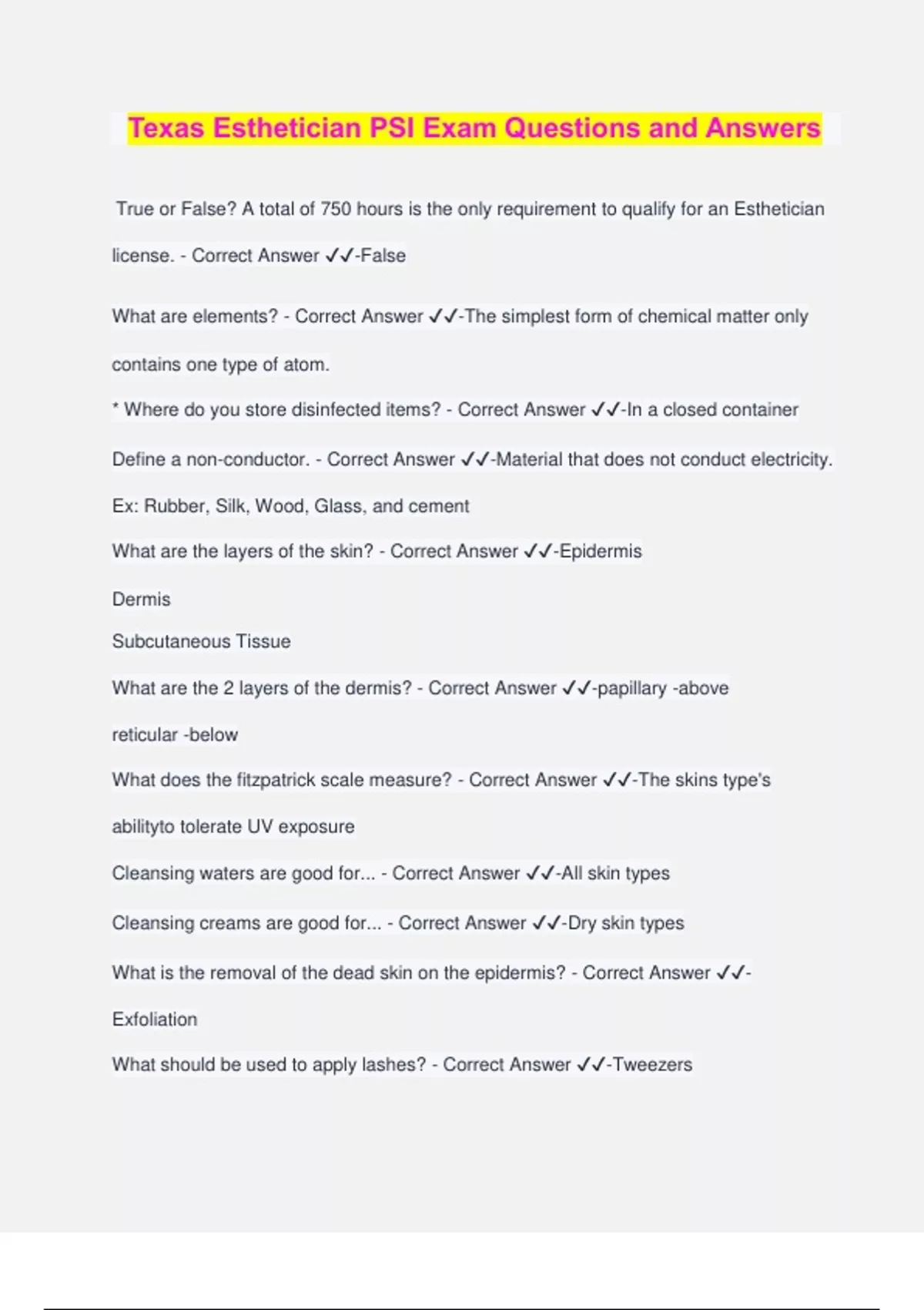 Texas Esthetician PSI Exam Questions and Answers True or False? A total of 750 hours is the only requirement to qualify for an Esthetician license. - Correct Answer ️️ -False What are elements? - Correct Answer ️️ -The simplest form of chemical matter only contains one type of atom. * Where do you store disinfected items? - Correct Answer ️️ -In a closed container Define a non-conductor. - Correct Answer ️️ -Material that does not conduct electricity. Ex: Rubber, Silk, Wood, Glass, and cement What are the layers of the skin? - Correct Answer ️️ -Epidermis Dermis Subcutaneous Tissue What are the 2 layers of the dermis? - Correct Answer ️️ -papillary -above reticular -below What does the fitzpatrick scale measure? - Correct Answer ️️ -The skins type's abilityto tolerate UV exposure Cleansing waters are good for... - Correct Answer ️️ -All skin types Cleansing creams are good for... - Correct Answer ️️ -Dry skin types What is the removal of the dead skin on the epidermis? - Correct Answer ️️ - Exfoliation What should be used to apply lashes? - Correct Answer ️️ -Tweezers * Under the Wood's Lamp, what color is Healthy/Normal Skin? - Correct Answer ️️ - Blue + White * Where would you find your clients approval for you to perform a service on them? - Correct Answer ️️ -Consent Form * Describe the 5 practices estheticians are allowed to perform under TDLR Regulations. - Correct Answer ️️ -#4 : cleansing, stimulating, or massaging a person's scalp, face, neck, or arms. #5 : beautifying a person's face, neck, or arms using cosmetic preparation #6: administering facial treatments #7: removing superfluous hair from a person's body using depilatories, precautions, or chemicals, tweezers #10: applying semi-permanent, thread-like extensions composed of single fibers to a person's eyelashes What is sanitation? - Correct Answer ️️ -A chemical process that reduces the number of disease-causing germs on cleaned surfaces to a safe level. What is sterilization? - Correct Answer ️️ -COMPLETELY Destroys all microbial life, incl. spores * What is Disinfection? - Correct Answer ️️ -A chemical process that uses specific products to destroy harmful organisms What does OSHA stand for? - Correct Answer ️️ -Occupational Safety and