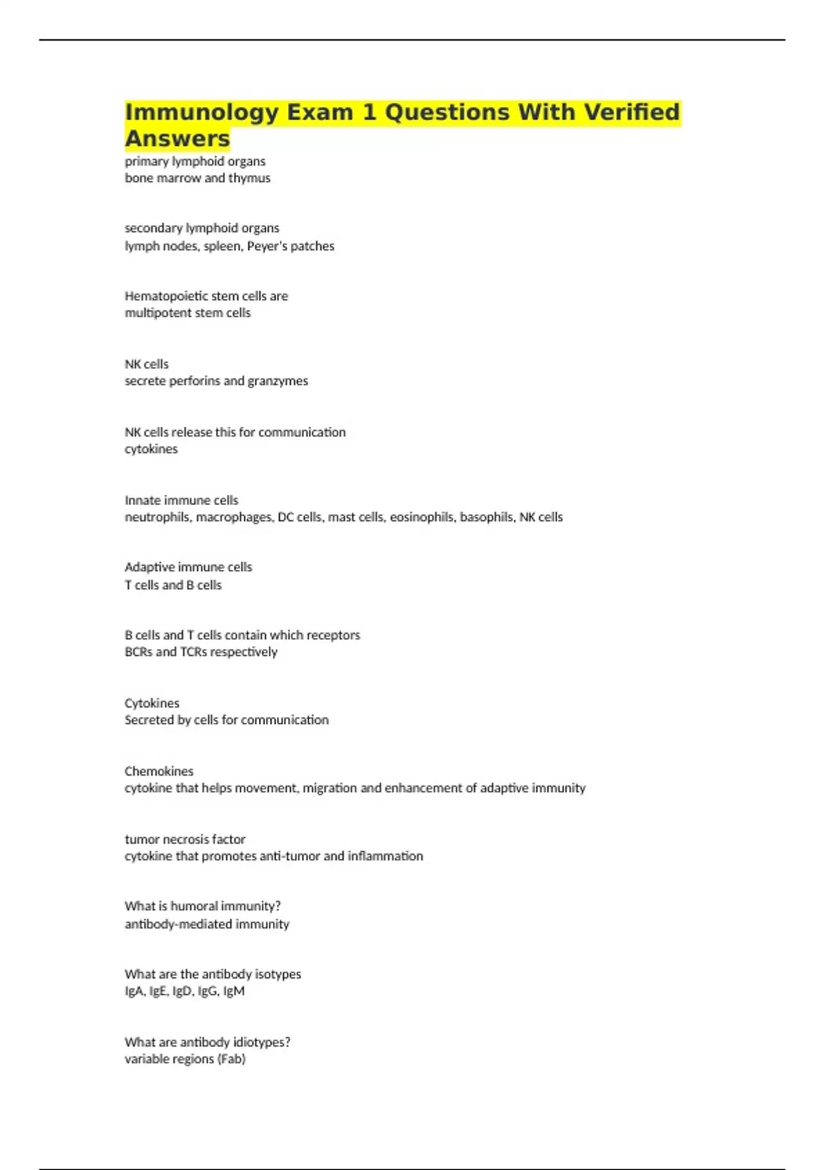 Immunology Exam 1 Questions With Verified Answers primary lymphoid organs bone marrow and thymus secondary lymphoid organs lymph nodes, spleen, Peyer's patches Hematopoietic stem cells are multipotent stem cells NK cells secrete perforins and granzymes NK cells release this for communication cytokines Innate immune cells neutrophils, macrophages, DC cells, mast cells, eosinophils, basophils, NK cells Adaptive immune cells T cells and B cells B cells and T cells contain which receptors BCRs and TCRs respectively Cytokines Secreted by cells for communication Chemokines cytokine that helps movement, migration and enhancement of adaptive immunity tumor necrosis factor cytokine that promotes anti-tumor and inflammation What is humoral immunity? antibody-mediated immunity What are the antibody isotypes IgA, IgE, IgD, IgG, IgM What are antibody idiotypes? variable regions (Fab) What antibody isotype is found in mucosal immunity? IgA what antibody is most common IgG Which antibody is first released IgM What determine if BCRs are membrane bound or secreted as antibodies mRNA splicing PRRs are located on innate immune cells Toll-like receptors (TLRs) plasma membrane PRRs for extracellular pathogens NOD-like receptors (NLRs) Cytoplasmic PRRs for intracellular pathogens Endosomal TLRs DNA/RNA pathogens Neutrophils phagocytes responsible for bacteria and some viruses the most abundant WBC is neutrophil DC cells are Phagocytes and antigen presenting cells DC cells are located in the blood and peripheral tissues Macrophages phagocytes located in tissues Which cells are antigen presenting cells B cells, macrophages, dendritic cells