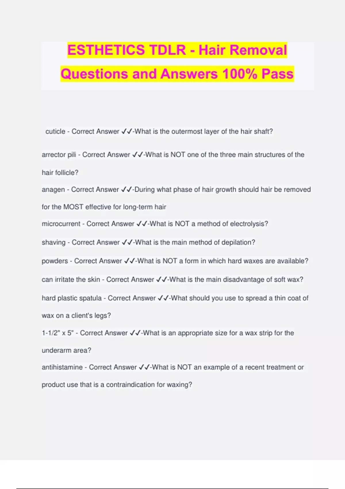 ESTHETICS TDLR - Hair Removal Questions and Answers 100% Pass cuticle - Correct Answer ️️ -What is the outermost layer of the hair shaft? arrector pili - Correct Answer ️️ -What is NOT one of the three main structures of the hair follicle? anagen - Correct Answer ️️ -During what phase of hair growth should hair be removed for the MOST effective for long-term hair microcurrent - Correct Answer ️️ -What is NOT a method of electrolysis? shaving - Correct Answer ️️ -What is the main method of depilation? powders - Correct Answer ️️ -What is NOT a form in which hard waxes are available? can irritate the skin - Correct Answer ️️ -What is the main disadvantage of soft wax? hard plastic spatula - Correct Answer ️️ -What should you use to spread a thin coat of wax on a client's legs? 1-1/2" x 5" - Correct Answer ️️ -What is an appropriate size for a wax strip for the underarm area? antihistamine - Correct Answer ️️ -What is NOT an example of a recent treatment or product use that is a contraindication for waxing? do a small patch test of the wax product to be used - Correct Answer ️️ -What should you do when performing wax treatments? 1/2 inch - Correct Answer ️️ -What is the SHORTEST length that you should trim hair before waxing? apply a cold compress with baking soda mixed in water to sensitive skin - Correct Answer ️️ -What should you do at the end of a waxing service? pluck stray hairs if the client's brows are uneven or too thin - Correct Answer ️️ -What should you NOT do when waxing a client's brows? American - Correct Answer ️️ -What type of bikini waxing involves the removal of hair outside the normal bikini line? 30 to 60 minutes - Correct Answer ️️ -How long do body waxing procedures usually take? 15 minutes - Correct Answer ️️ -How long does it take to melt soft wax if the wax holder is about a quarter to half full? 45 degrees - Correct Answer ️️ -At what angle should you hold the spatula when applying soft wax? five seconds - Correct Answer ️️ -How long should you press your finger to the waxed area immediately after removing the wax? apply a tiny amount of lotion - Correct Answer ️️ -What should you do