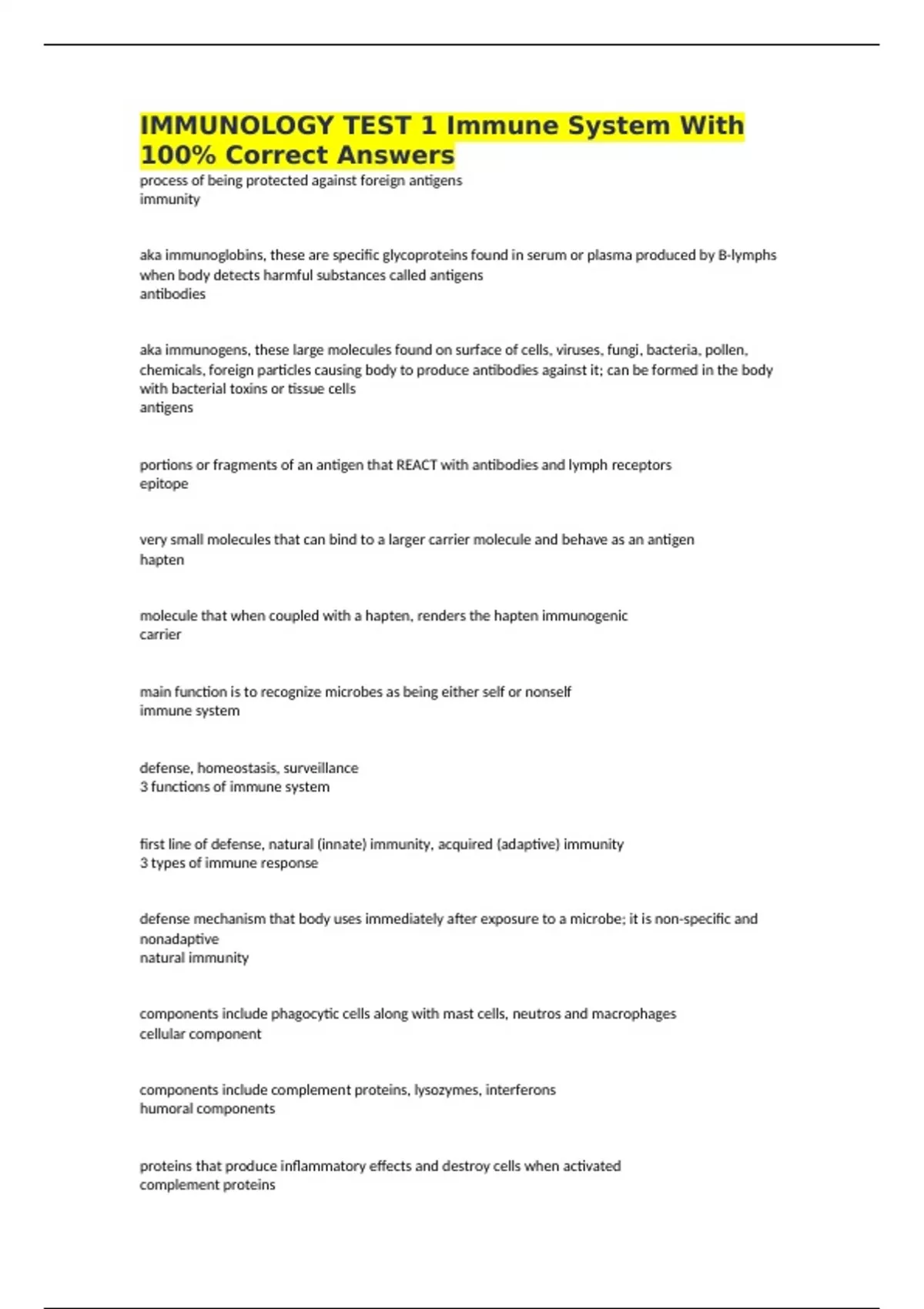 IMMUNOLOGY TEST 1 Immune System With 100% Correct Answers