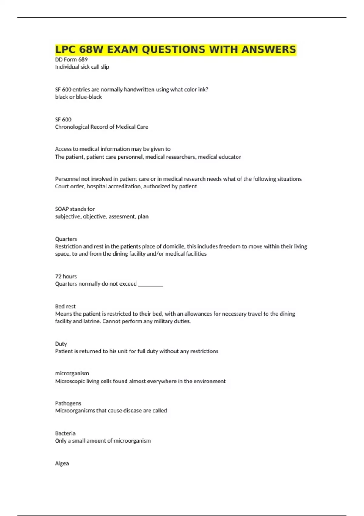 LPC 68W EXAM QUESTIONS WITH ANSWERS DD Form 689 Individual sick call slip SF 600 entries are normally handwritten using what color ink? black or blue-black SF 600 Chronological Record of Medical Care Access to medical information may be given to The patient, patient care personnel, medical researchers, medical educator Personnel not involved in patient care or in medical research needs what of the following situations Court order, hospital accreditation, authorized by patient SOAP stands for subjective, objective, assesment, plan Quarters Restriction and rest in the patients place of domicile, this includes freedom to move within their living space, to and from the dining facility and/or medical facilities 72 hours Quarters normally do not exceed ________ Bed rest Means the patient is restricted to their bed, with an allowances for necessary travel to the dining facility and latrine. Cannot perform any military duties. Duty Patient is returned to his unit for full duty without any restrictions microrganism Microscopic living cells found almost everywhere in the environment Pathogens Microorganisms that cause disease are called Bacteria Only a small amount of microorganism Algea Resemble plant cells found on sunlit water and rarely cause human disease Fungi Such as yeast and molds Protozoa Single celled microscopic microorganisms Bacteria Single celled organisms without a nucleus Viruses Must use the hosts ability to make protein and energy. immunization Most effective means for preventing viral infections microorganism that is the most difficult to control and destroy Spore forming bacteria chain of infection pathogen, reservoir, portal of exit, means of transmission, portal of entry, new host Hand washing Most effective and useful means of breaking the chain of infection communicable disease a disease that is spread from one host to another contagious disease a type of communicable disease that spreads quickly from person to person epidemic large outbreak of a particular disease in a specific area Pathogenic microorganisms Microorganisms that cause disease nosocomial infection an infection acquired during hospitalization Hand washing Single most useful and effective means of breaking the chain of infection Air borne precautions, droplet precautions, contact precautions Three types of transmission based precautions Airborne precautions Private rooms that have motonired negative air flow pressure and door should remain closed TB Droplet precautions Private room room or share with same infectious patient, with doors that may remain open Wear a mask when working within 3 feet of the patient and require the patient to wear a mask if being transported Contact precautions MOST FREQUENT MODE OF DISEASE TRANSMISSION Private room or share with same infectious patient. The doors ay remain open. Try to restrict the use of non critical equipment to one patient only and disinfect that equipment before using on other patients Surgical asepsis No organisms are carried to then carried to the patient. Microorganisms are destroyed from surfaces before they can enter the body. 10 to 15 to 2 min or longer Hand washing time Incubation period First phase when pathogen enters body and first signs and symptoms Prodromal stage Onset of initial symptoms such as fatigue or low grade fever to more severe symptoms Full stage of illness Symptoms are acute and specific to the type of infection such as lesions covering the body or high fever Convalescent stage When acute symptoms of the infection subside and the person recovers Oral The most common way to give medications