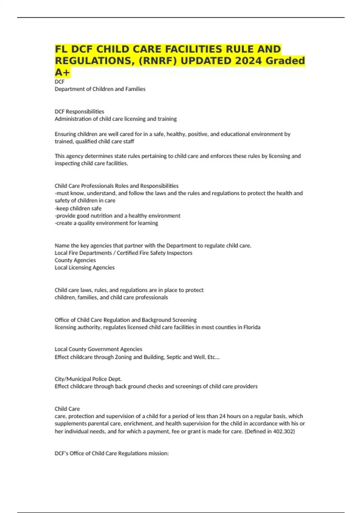 FL DCF CHILD CARE FACILITIES RULE AND REGULATIONS, (RNRF) UPDATED 2024 Graded A+