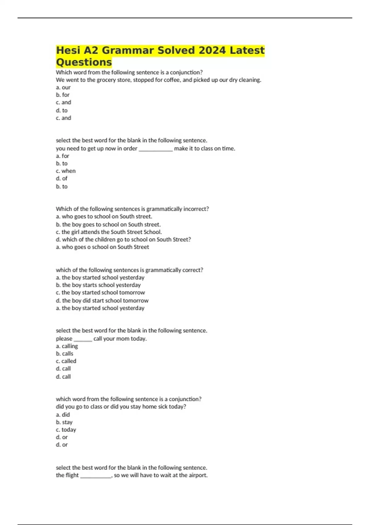 Hesi A2 Grammar Solved 2024 Latest Questions Which word from the following sentence is a conjunction? We went to the grocery store, stopped for coffee, and picked up our dry cleaning. a. our b. for c. and d. to c. and select the best word for the blank in the following sentence. you need to get up now in order ___________ make it to class on time. a. for b. to c. when d. of b. to Which of the following sentences is grammatically incorrect? a. who goes to school on South street. b. the boy goes to school on South street. c. the girl attends the South Street School. d. which of the children go to school on South Street? a. who goes o school on South Street which of the following sentences is grammatically correct? a. the boy started school yesterday b. the boy starts school yesterday c. the boy started school tomorrow d. the boy did start school tomorrow a. the boy started school yesterday select the best word for the blank in the following sentence. please ______ call your mom today. a. calling b. calls c. called d. call d. call which word from the following sentence is a conjunction? did you go to class or did you stay home sick today? a. did b. stay c. today d. or d. or select the best word for the blank in the following sentence. the flight __________, so we will have to wait at the airport. a. delays b. delayed c. is delayed d. will delay c. is delayed which of the following sentences is grammatically incorrect? a. monitors track the patient's heart rate and oxygen levels b. monitor track the patient's heart rate and oxygen levels c. you should carefully monitor the patients' vital signs d. watch the monitors from the nurses' station b. monitor track the patient's heart rate and oxygen levels which of the following sentences is grammatically correct? a. I need to do my homework now, so I can go to the movie now. b. I need to do my homework now, so I cannot go the to the movie now. c. I need to doing my homework now, so I cannot go to the movie now. d. I need to do my homework now, so I cannot going to the movie now. b. I need to do my homework now, so I cannot go the to the movie now. which work from the following sentence is a noun? the puppy's favorite toy is pink and fuzzy. a. pink b. fuzzy c. favorite d. toy d. toy which word from the following sentence is the subject? the bill will ring in five minutes. a. bell b. five c. will d. minutes d. minutes which of the following sentences is grammatically correct? a. you can have either the cake nor the cookie. b. you can't have neither the cake or the cookie. c. you can have either the cake or the cookie d. you can having either the cake or the cookie c. you can have either the cake or the cookie which word of the following sentence is a noun? put the groceries on the table, please. a. table b. put c. please d. on d. on which word of the following sentence is a preposition? he checked into the hospital early hat morning for his surgery. a. checked b. he c. into d. hospital c. into which of the following sentences is grammatically correct? a. who is going to class on Saturday. b. who is goes to class on Saturday? c. whose going to class on Saturday? d. who is going to class on Saturday? d. who is going to class on Saturday? which word from the following sentence is a subject? after the children finished painting, they had to clean up their mess. a. mess b. painting c. finished d. they d. they which word from the following sentence is a subject? she popped popcorn, grabbed a drink, and sat down to watch her favorite show. a. she b. popcorn c. drink d. show a. she select the best word for the bank in the following sentence. __________ you want to work in home health care after graduation? a. does b. do c. was d. doing b. do which word in the following sentence is incorrect? the members of the team, all of whom played good in the game last night, are having celebratory dinner. a. team b. whom c. good d. are c. good select the best word or phrase for the blank in the following sentence. she __________ a doctor's appointment in the morning, so she was late to work that day. a. has b. had c. will have d. was b. had which of the following sentences is grammatically correct? a. the baby is due in December. b. the baby dies in December c. the babies is due in December d. the baby are due in December a. the baby is due in December which word from the following sentence is a direct object? she finished decorating the kitchen for the party early that morning. a. morning b. she c. kitchen d. early c. kitchen which word from the following sentence is a direct object? he was scheduled to work a long shift. a. shift b. he c. long d. work a. shift which of the following sentences is grammatically correct? a. I learned to write good working at the paper. b. I learned to write well working at the paper. c. I teached to write well working at the paper. d. I learned to write well working to the paper. b. I learned to write well working at the paper which of the following sentences is grammatically incorrect? a. the librarian at the reference desk is very helpful. b. the reference desk librarian is very helpful. c. is the reference desk librarian helpful? d. can the reference desk librarian helpful? d. can the reference desk librarian helpful? in the following sentence, which is the dependent clause? the librarian who works on Sunday had to leave early because she wanted to see a play. a. the librarian who works on Sunday b. had to leave early c. because she wanted to see a play d. the librarian who works on Saturday had to leave early c. because she wanted to see a play in the following sentence, which is the dependent clause? although we left the baseball game early, we still got stuck in heavy traffic. a. although we left the baseball game early b. we left c. we still got stuck in heavy traffic d. in heavy traffic c. we still got stuck in heavy traffic which of the following sentences is grammatically correct? a. the baseball game was cancelled because of 