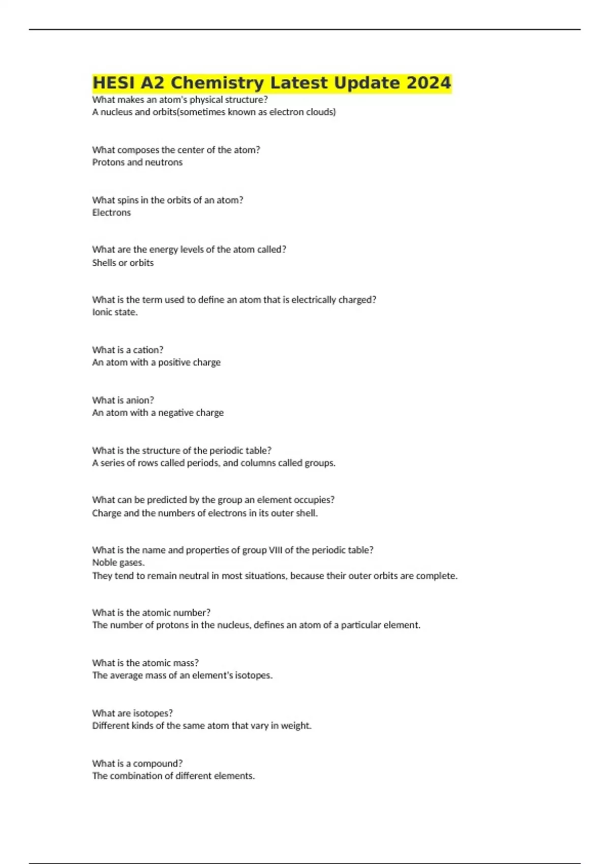 HESI A2 Chemistry Latest Update 2024 What makes an atom's physical structure? A nucleus and orbits(sometimes known as electron clouds) What composes the center of the atom? Protons and neutrons What spins in the orbits of an atom? Electrons What are the energy levels of the atom called? Shells or orbits What is the term used to define an atom that is electrically charged? Ionic state. What is a cation? An atom with a positive charge What is anion? An atom with a negative charge What is the structure of the periodic table? A series of rows called periods, and columns called groups. What can be predicted by the group an element occupies? Charge and the numbers of electrons in its outer shell. What is the name and properties of group VIII of the periodic table? Noble gases. They tend to remain neutral in most situations, because their outer orbits are complete. What is the atomic number? The number of protons in the nucleus, defines an atom of a particular element. What is the atomic mass? The average mass of an element's isotopes. What are isotopes? Different kinds of the same atom that vary in weight. What is a compound? The combination of different elements. What do chemical reactions resemble? A cooking recipe. What are the reactants in a chemical reaction? The ingredients of a chemical reaction. What is the term given to the results of a chemical reaction? The products. Why must a chemical equation be balanced at the end of a reaction? Because the law of conservation of mass indicates that mass cannot be created nor destroyed in a chemical reaction. What are equilibrium reactions? Chemical reactions that stop before all the reactants are used to make the products. What causes equilibrium? The state in which reactants are forming products at the same rate that products are forming reactants. What are the four basic ways to increase the reaction rate? Increase temperature Increase the surface area of the reactants Add a catalyst Increase the concentration of the reactants. What does increasing temperature cause in a chemical reaction? The particles have greater kinetic energy, increasing the speed at which they move around, and the chance of collision between particles. How does increasing the surface area of the particles in a reaction speed chemical reactions? Gives the Particles more opportunities to come in contact with each other. What is a catalyst? An agent that accelerates a chemical reaction by reducing the activation energy or the amount of energy necessary for a reaction to occur. What is the effect of increasing the concentration of reactants in a chemical reaction? More chance collisions occur between the reactants, producing more products. What is a solution? A homogeneous mixture of two or more substances. What is a solute? The part of a solution being dissolved. What is a solvent? The part of a solution the solute is being dissolved in. What are compounds? Mixtures of different elements to create a single matter. What are alloys? Solid solutions of metals to make a new one. e.g. bronze ( a mixture between copper and tin) What are Amalgams? A specific type of alloy in which another metal is dissolved in Mercury. What are emulsions? Mixtures of matter that readily separate such as water and oil. What occurs in a synthesis reaction? Two elements combine to form a product. What occurs in a decomposition reaction? Breaks a compound into its component parts. What occurs in a combustion reaction? An exothermic (explosive) reaction occurs. Usually initiated by heat acting on oxygen and a fuel compound such as hydrocarbon. What are the products of the combustion of hydrocarbon? Carbon dioxide and water. What occurs in a single replacement chemical reaction? An ionic compound reacts with a more active metal to create a new compound. What occurs in a double replacement compound? Involves two ionic compounds The positive ion from one compound combines with the negative ion from another compound. What is the result of a double replacement compound? Two new ionic compounds that have "switched partners" AB + XY ---> AY + XB What is chemical bonding? The joining of an atom, element, or chemical to another.
