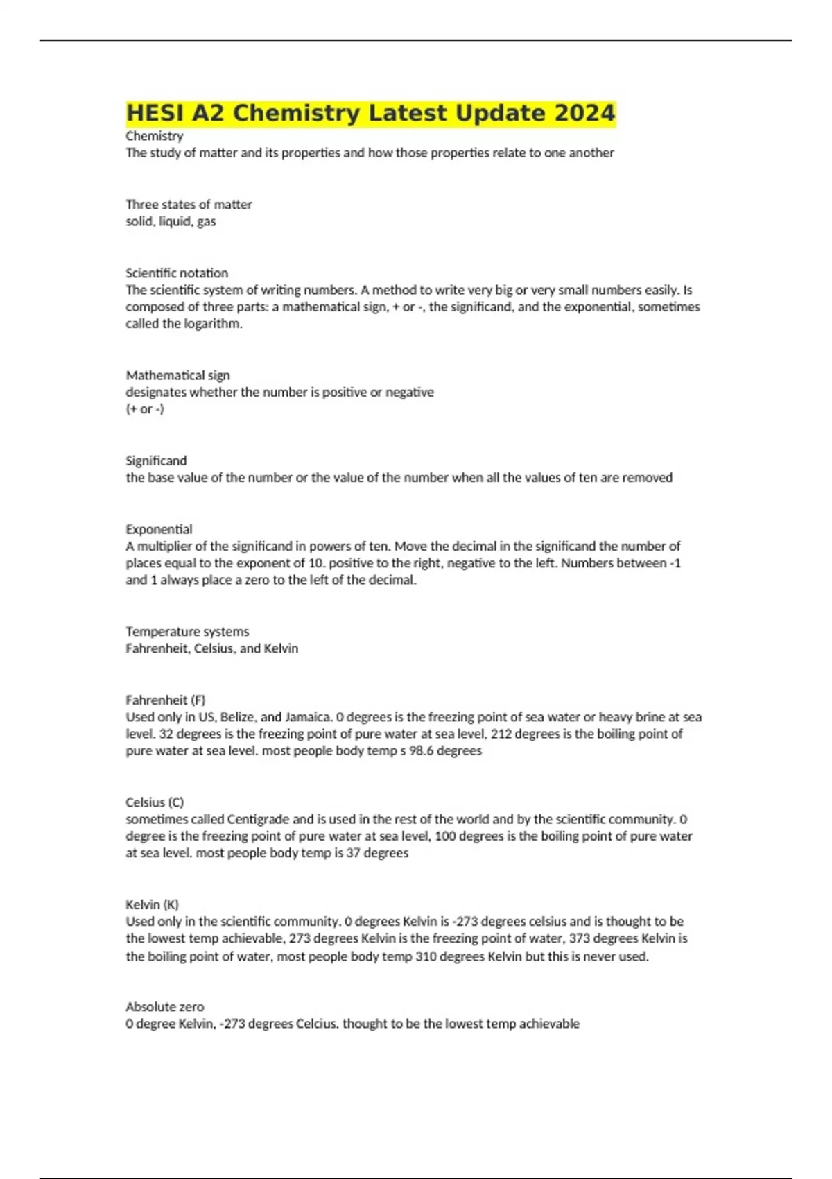 HESI A2 Chemistry Latest Update 2024 Chemistry The study of matter and its properties and how those properties relate to one another Three states of matter solid, liquid, gas Scientific notation The scientific system of writing numbers. A method to write very big or very small numbers easily. Is composed of three parts: a mathematical sign, + or -, the significand, and the exponential, sometimes called the logarithm. Mathematical sign designates whether the number is positive or negative (+ or -) Significand the base value of the number or the value of the number when all the values of ten are removed Exponential A multiplier of the significand in powers of ten. Move the decimal in the significand the number of places equal to the exponent of 10. positive to the right, negative to the left. Numbers between -1 and 1 always place a zero to the left of the decimal. Temperature systems Fahrenheit, Celsius, and Kelvin Fahrenheit (F) Used only in US, Belize, and Jamaica. 0 degrees is the freezing point of sea water or heavy brine at sea level. 32 degrees is the freezing point of pure water at sea level, 212 degrees is the boiling point of pure water at sea level. most people body temp s 98.6 degrees Celsius (C) sometimes called Centigrade and is used in the rest of the world and by the scientific community. 0 degree is the freezing point of pure water at sea level, 100 degrees is the boiling point of pure water at sea level. most people body temp is 37 degrees Kelvin (K) Used only in the scientific community. 0 degrees Kelvin is -273 degrees celsius and is thought to be the lowest temp achievable, 273 degrees Kelvin is the freezing point of water, 373 degrees Kelvin is the boiling point of water, most people body temp 310 degrees Kelvin but this is never used. Absolute zero 0 degree Kelvin, -273 degrees Celcius. thought to be the lowest temp achievable Melting ice 21 degrees Celcius and 32 degrees Fahrenheit Normal body temp 37 degrees Celcius and 98.6 degrees Fahrenheit Boiling water 100 degrees Celcius and 212 degrees Fahrenheit Atom The basic building block of all molecules. most stable when an orbital is full. The simplest form of matter that can naturally exist in nature. Physical structure of an Atom nucleus and orbits, which are sometimes called electron cloud. Nucleus at the center of the atom and composed of protons and neutrons Orbits sometimes called electron cloud, located at the outermost part of the atom and is where the electrons are Electron spins around (orbits) the nucleus at various energy levels called orbits or shells so fast forming electron clouds. Shell or Orbits various energy levels around the nucleus Proton charge has a positive electrical charge Electron charge has a negative charge Neutron charge has no charge at all Ground state atom tend to have equal numbers of protons and electrons making them electrically neutral. Ion or Ionic state An atom that is electrically charged (+ or -) either by losing or gaining electrons Cation An atom with a positive charge Anion An atom with a negative charge Periodic Table A table made up of a series of rows and columns of the known elements arranged according to their properties. Period The rows on a periodic table Group The columns on a periodic table Group 1A +1 charge 1 electron in the outer shell Group 2A +2 charge 2 electrons in the outer shell Group 3A +3 charge 3 electrons in the outer shell Group 4A +4 or -4 charge 4 electrons in the outer shell Group 5A -3 charge 5 electrons in the outer shell Group 6A -2 charge 6 electrons in the outer shell Group 7A -1 charge 7 electrons in the outer shell Group 8A called noble gases has no charge, these gases are very stable and chemically inert Transition metals The groups 3 3B through 12 2B Atomic number The number of protons in the nucleus. Is located at the top of each of the squares in a periodic table. Is always a whole number. Atomic mass The average mass of each of that element's isotopes. Is the number at the bottom of each of the squares in the periodic table, and is usually a decimal number Isotopes Different kinds of the same atom that vary in weight based on the number of neutrons in the nucleus. written as an abbreviation with the symbol of the element preceded by a superscript number indicating the atomic mass Compound A combination of elements Mixtures of different elements to create a single matter Chemical equations recipes Reactants ---> Products Reactant the ingredients in a chemical reaction Products desired end result or compound Law of conservation of mass mass cannot be created or destroyed during a chemical reaction. Equilibrium A state in which reactants are forming products at the same rate that products are forming reactants. Reactions may stop before all of the reactants are used to make products A reaction at equilibrium can be said to be reversible. A+B <---> C+D 4 Ways to increase the reaction rate 1. Increase temperature 2. Increase surface area 3. Add a catalyst 4. Increase the concentrations of reactants