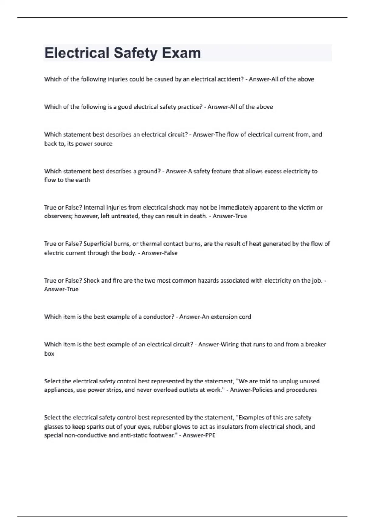 Which of the following injuries could be caused by an electrical accident? - Answer-All of the above Which of the following is a good electrical safety practice? - Answer-All of the above Which statement best describes an electrical circuit? - Answer-The flow of electrical current from, and back to, its power source Which statement best describes a ground? - Answer-A safety feature that allows excess electricity to flow to the earth True or False? Internal injuries from electrical shock may not be immediately apparent to the victim or observers; however, left untreated, they can result in death. - Answer-True True or False? Superficial burns, or thermal contact burns, are the result of heat generated by the flow of electric current through the body. - Answer-False True or False? Shock and fire are the two most common hazards associated with electricity on the job. - Answer-True Which item is the best example of a conductor? - Answer-An extension cord Which item is the best example of an electrical circuit? - Answer-Wiring that runs to and from a breaker box Select the electrical safety control best represented by the statement, "We are told to unplug unused appliances, use power strips, and never overload outlets at work." - Answer-Policies and procedures Select the electrical safety control best represented by the statement, "Examples of this are safety glasses to keep sparks out of your eyes, rubber gloves to act as insulators from electrical shock, and special non-conductive and anti-static footwear." - Answer-PPESelect the electrical safety control best represented by the statement, "This is an administrative control mandated by regulatory agencies or employers to make sure you have the knowledge and skills to stay safe around electricity at work." - Answer-Training