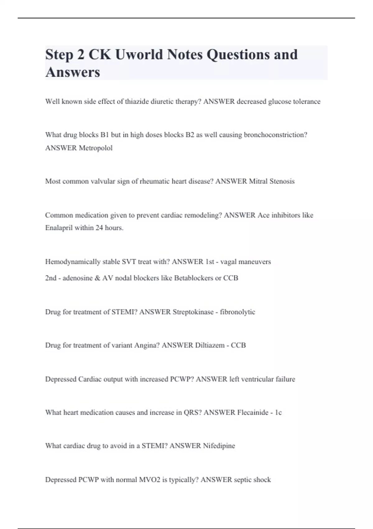 Step 2 CK Uworld Notes Questions and Answers Well known side effect of thiazide diuretic therapy? ANSWER decreased glucose tolerance What drug blocks B1 but in high doses blocks B2 as well causing bronchoconstriction? ANSWER Metropolol Most common valvular sign of rheumatic heart disease? ANSWER Mitral Stenosis Common medication given to prevent cardiac remodeling? ANSWER Ace inhibitors like Enalapril within 24 hours. Hemodynamically stable SVT treat with? ANSWER 1st - vagal maneuvers 2nd - adenosine & AV nodal blockers like Betablockers or CCB Drug for treatment of STEMI? ANSWER Streptokinase - fibronolytic Drug for treatment of variant Angina? ANSWER Diltiazem - CCB Depressed Cardiac output with increased PCWP? ANSWER left ventricular failure What heart medication causes and increase in QRS? ANSWER Flecainide - 1c What cardiac drug to avoid in a STEMI? ANSWER Nifedipine Depressed PCWP with normal MVO2 is typically? ANSWER septic shock